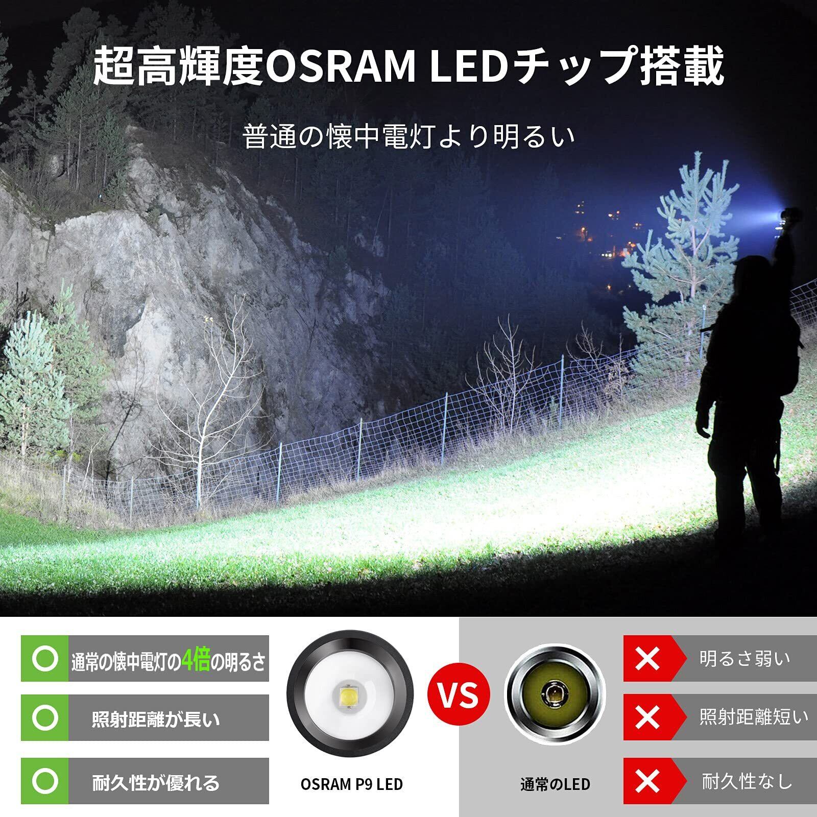 【コンパクト・超高輝度LED懐中電灯】OSRAM社製の超高輝度LEDチップを搭載しておりますので、明るい光を遠くまで届けます。高輝度のLEDチップと高機能素材を兼ね備えた、安価で実用性と耐久性が織り込まれた懐中電灯です。また、コンパクトなサイズですので、リュックや非常持ち出し袋などに簡単に収納可能です。