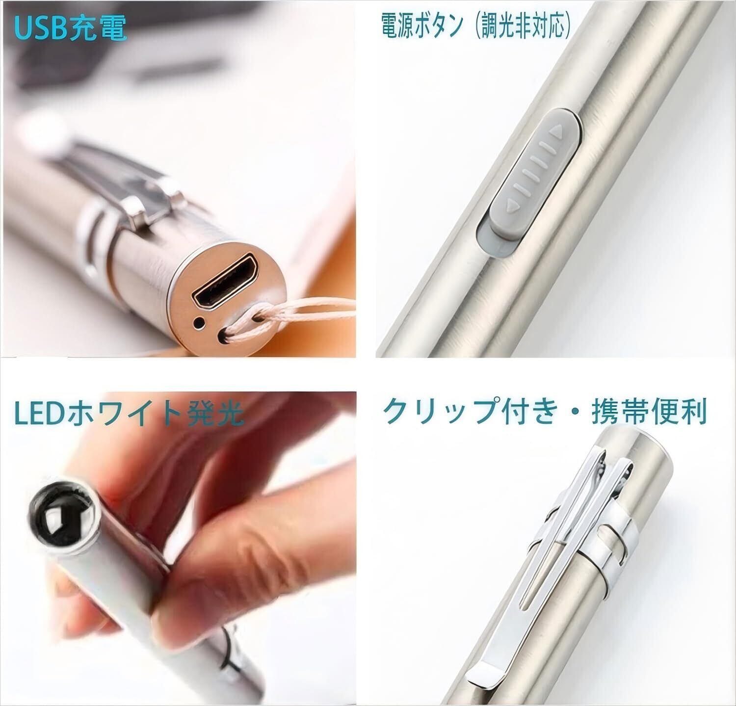 【充電モード】USB充電できるペンライトです。便利に充電できます。充電2時間で、約2時間ご使用できます。充電中の場合、青い提示ライトが点灯します。充電完了の場合は消灯します