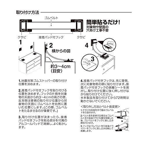 地震対策ゴムストッパー 【セット内容】接着パッド付フック+ゴムベルト×2本、アルコールパッド×2枚