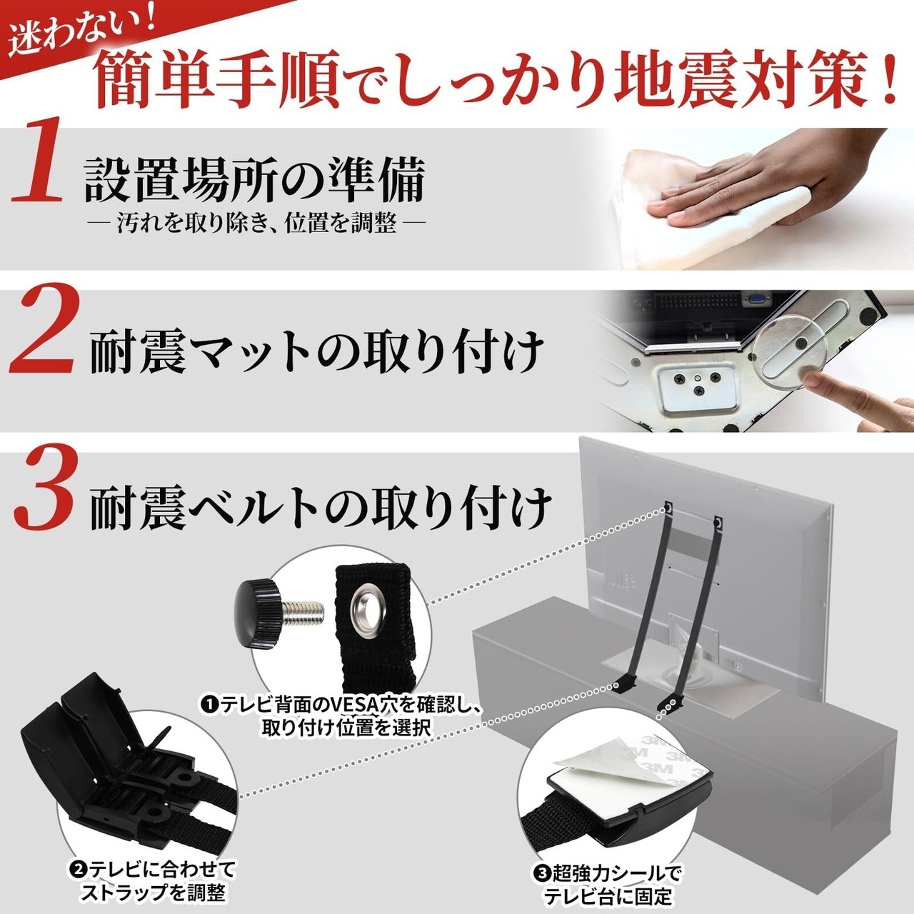 【高品質な素材で強力固定】 3M製の接着マットを採用。家具を傷つけず、強力に固定します。地震対策としてはもちろんのこと、子供やペットのいたずらによる転倒防止にも役立ちます。75インチまでの大型テレビにも対応可能。
