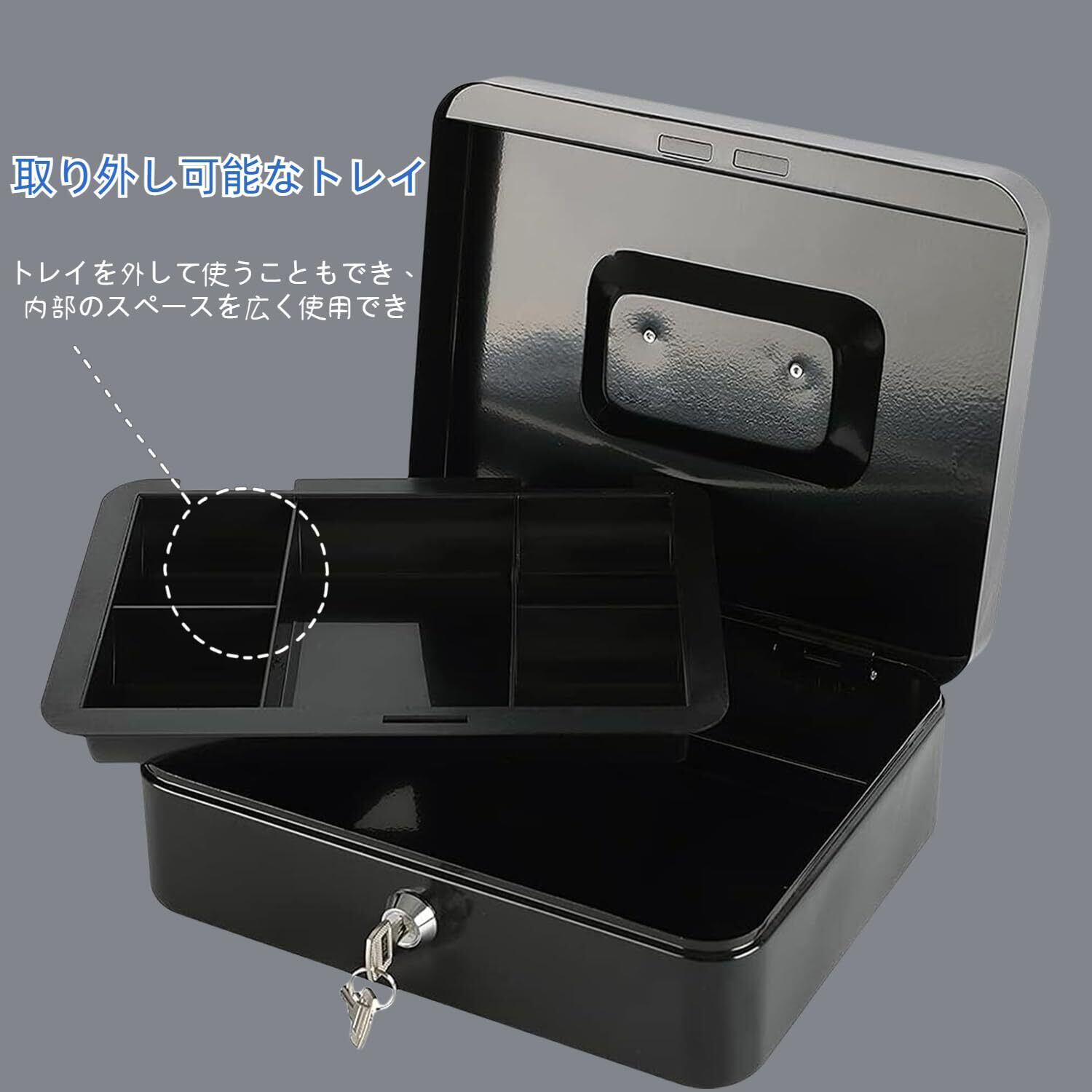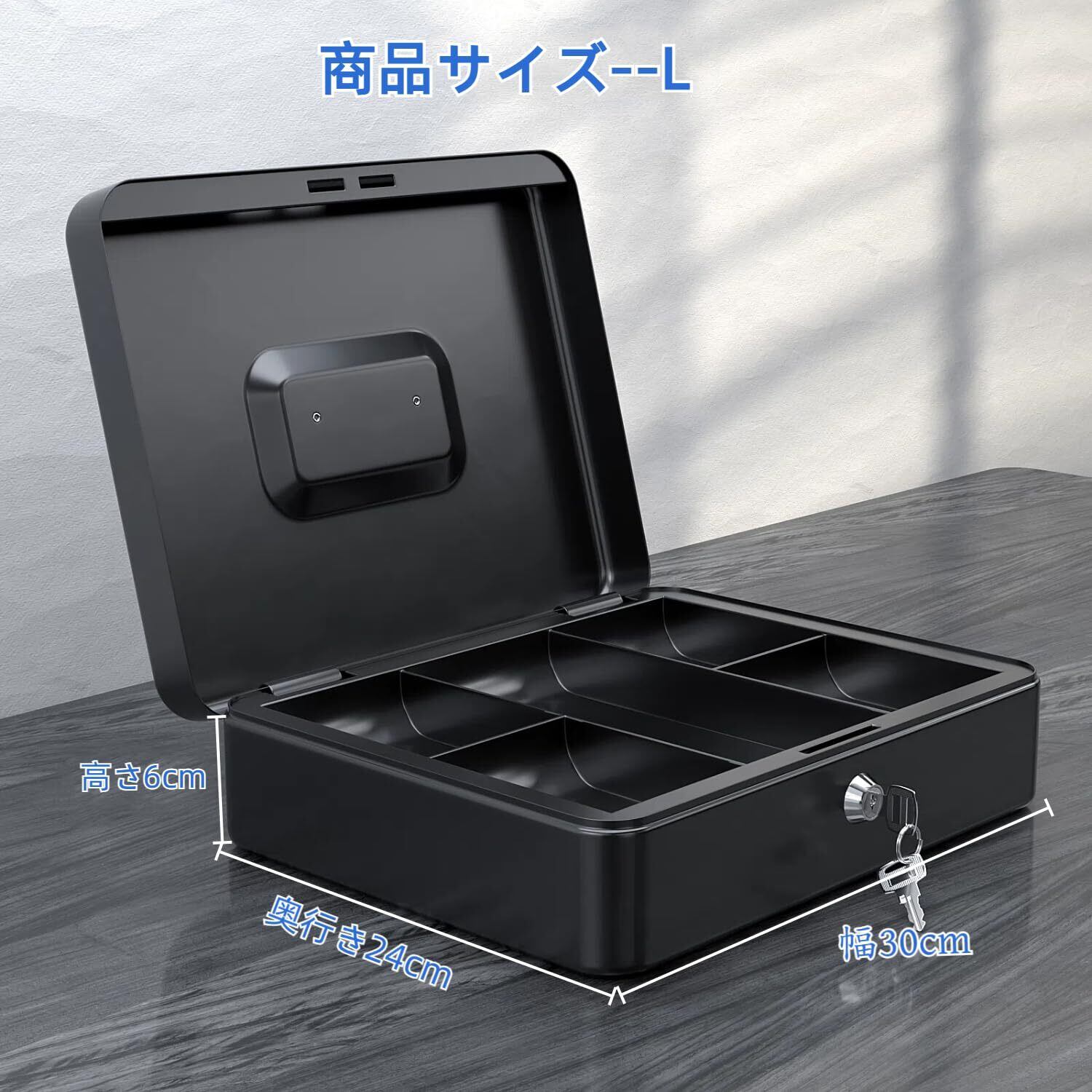 Point 5【十分な収納スペース】商品サイズ:幅30cm*奥行き24cm*高さ9cmさらに収納性を高めるために、内側にABS製の取り外し可能なトレイを配置しました。もちろん、トレイを外してそのまま金庫や貯金箱として使うこともでき、内部のスペースをより広く使用できます。(トレイを外す場合に、内部サイズ:幅29.8cm*奥行き23.8cm*高さ8.8cm).