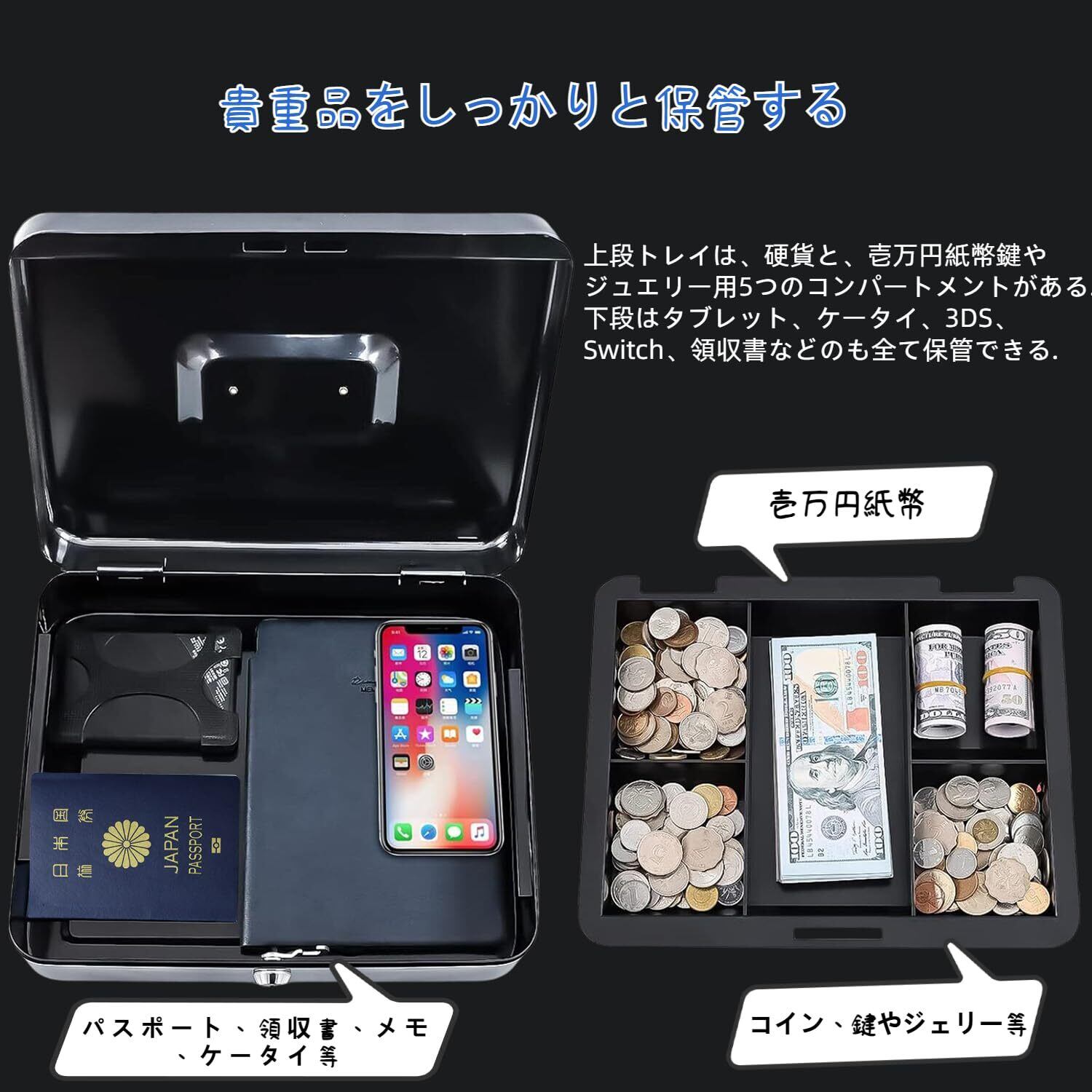 Point 4【多彩なニーズに応える上段トレイと下段設計】 本体サイズにあわせて設定された上段トレイは、硬貨収納用と、壱万円紙幣を折らずに収納できる、鍵やジュエリー用の5つのコンパートメントがあります。下段はタブレット、ケータイ、3DS、Switch、領収書などのも全て保管できるサイズです。様々な用途に合わせて選べます。