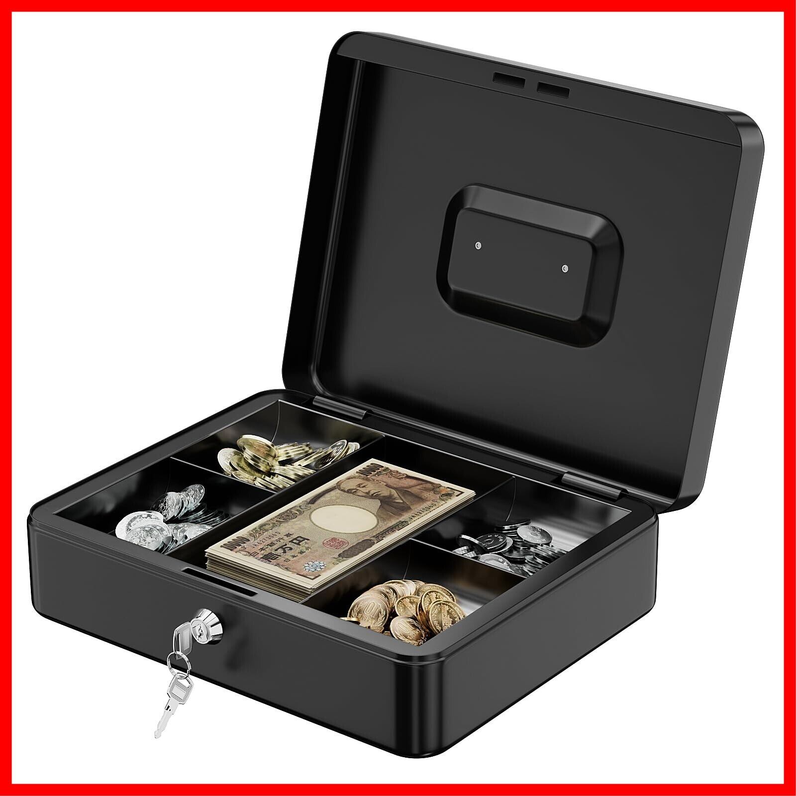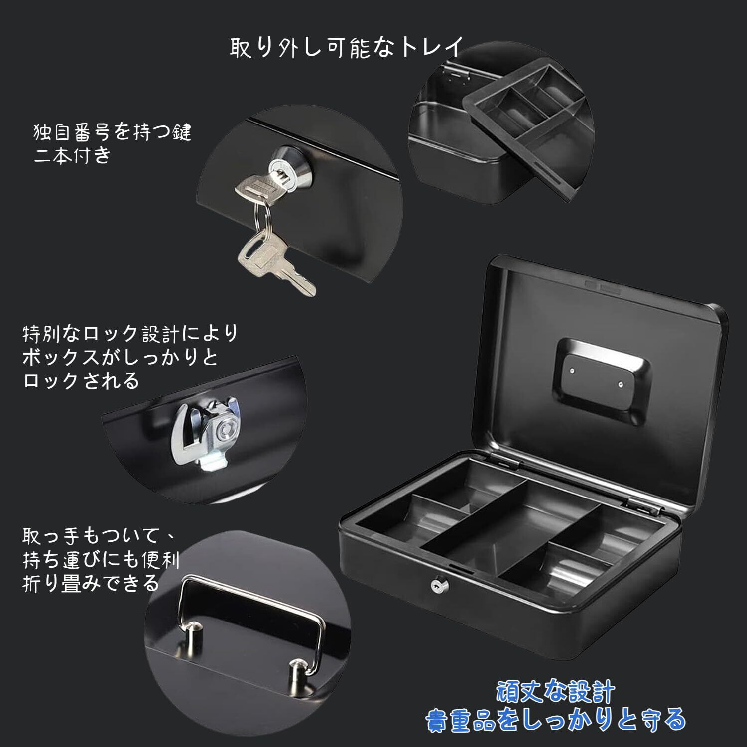 Point 2【スタイリッシュな見た目】高級感のあるブラックカラー、高品質かつ頑丈なスチール製のボディ、置き場所を選ばないシンプルデザイン、ご家庭やオフィス、お店等の場所どこにでもなじむやさしいです。コイントレー、紙幣が折らずに入る収納スペース、またスチール製の取っ手つき、抜ける可能性はありません!持ち運び易くで移動する際には便利です。