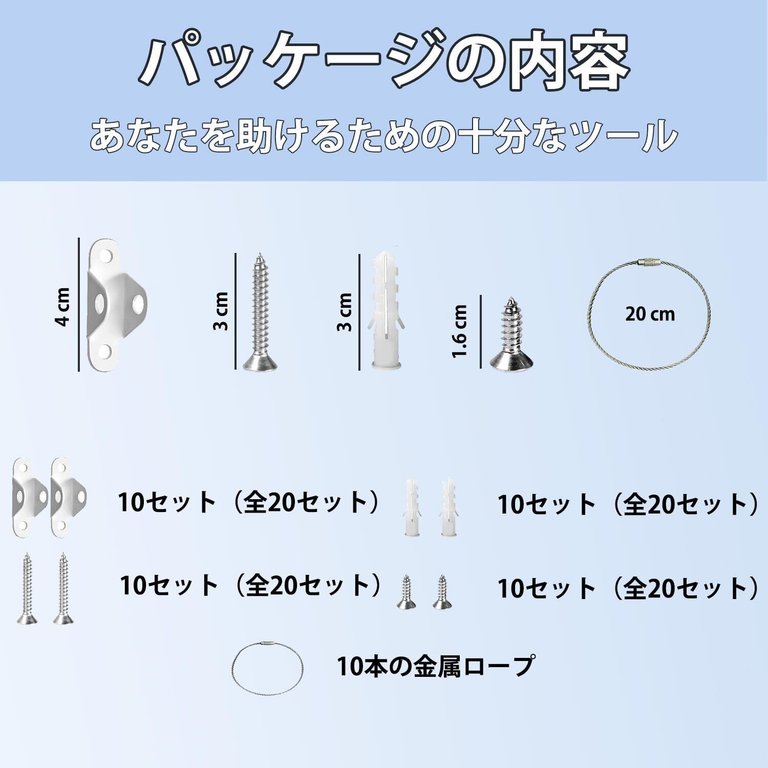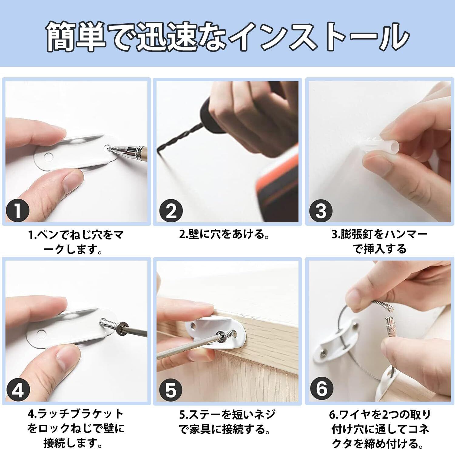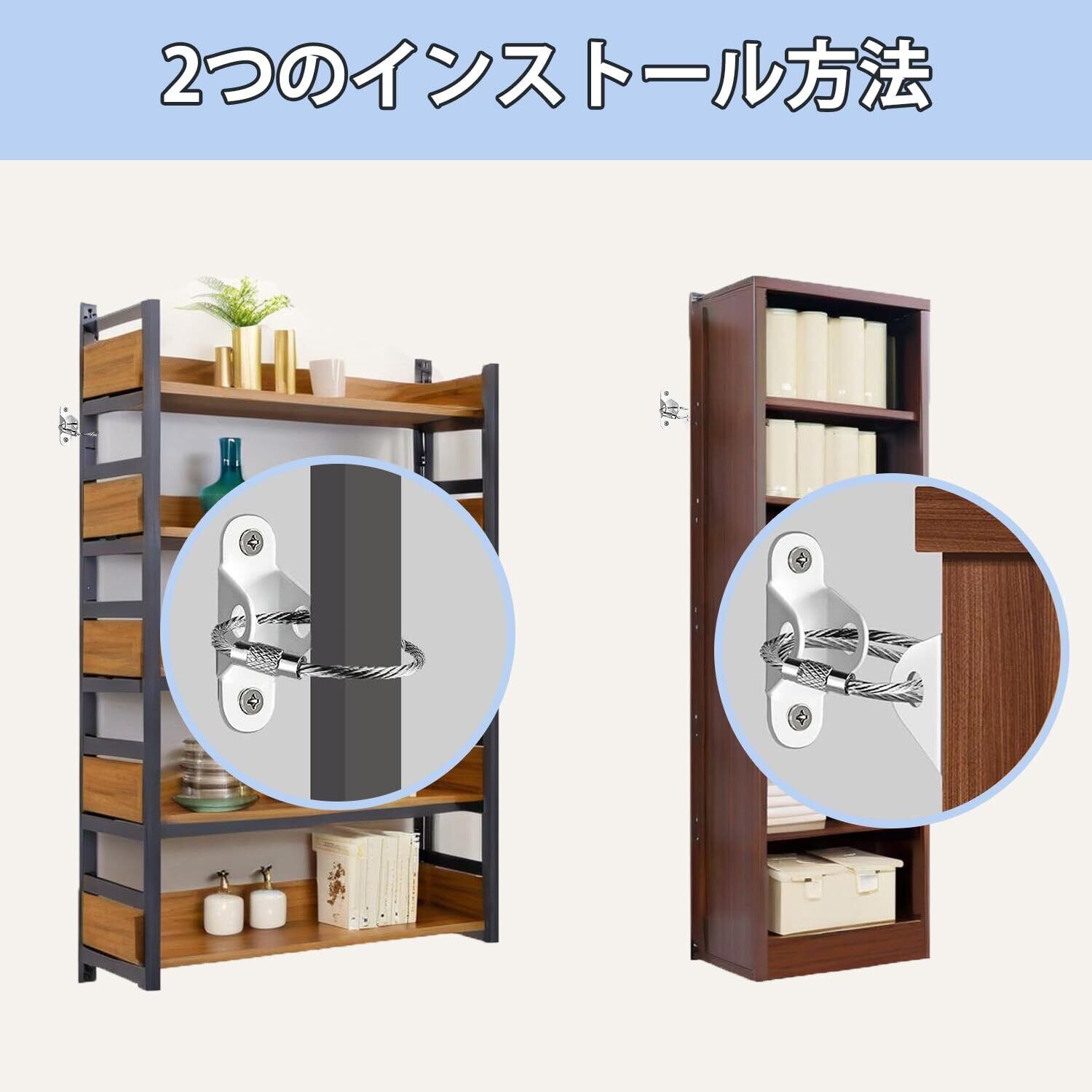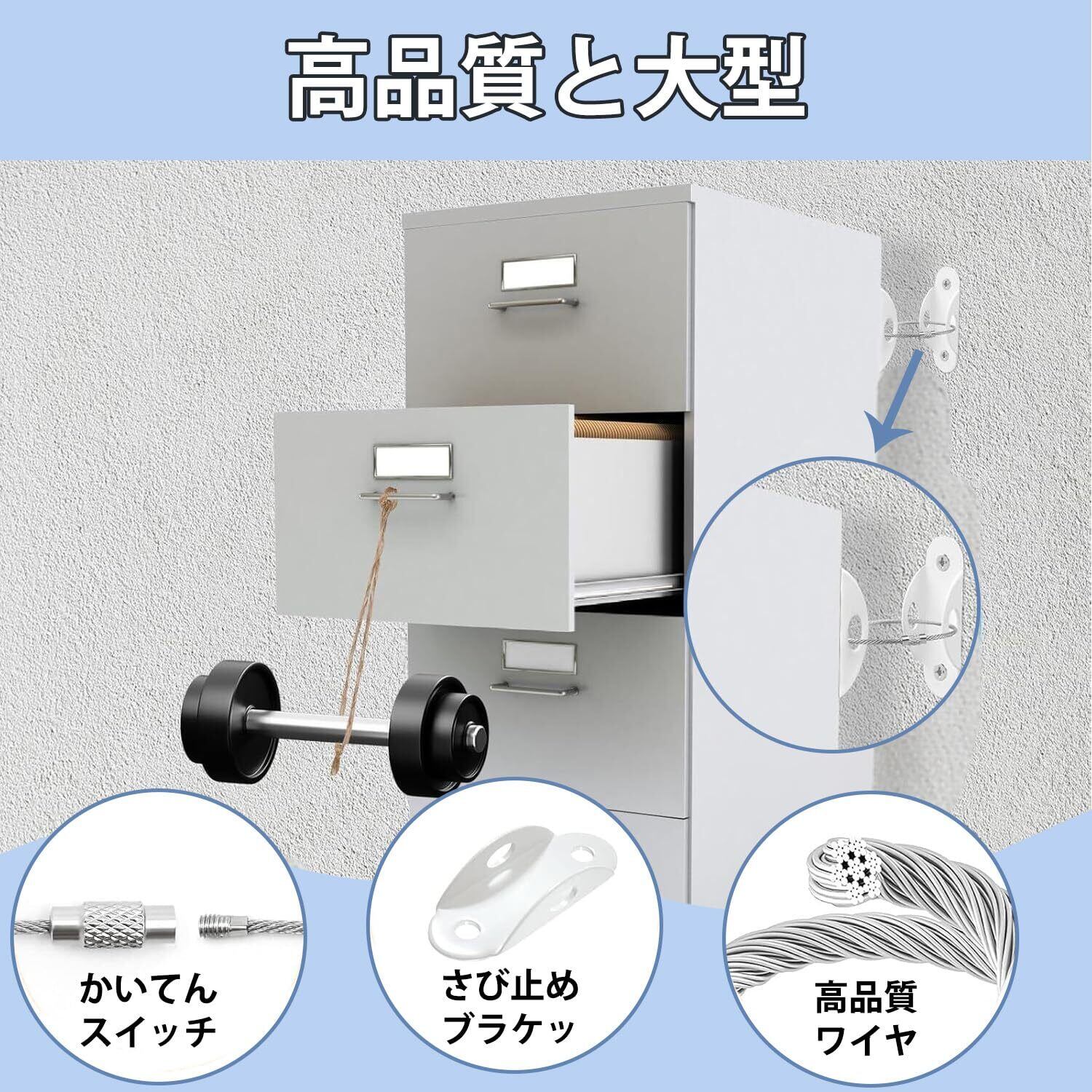 耐震金具:壁と家具に金具を取り付け、鋼線ロープを通すことで家具をしっかり固定します。高強度で錆にくい材質を使用しているため、長期使用も家具や本棚などの転倒を防ぎ、家族の安全をしっかり守ります。