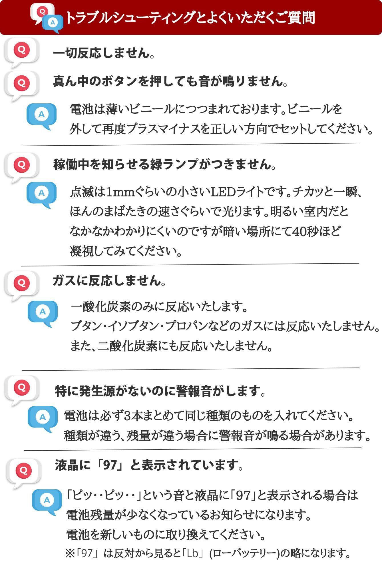 電池・収納袋付きで即使用可能. 単3電池3個で長時間動作する電気化学センサー方式を採用。工事不要、配線不要で購入後すぐに使用できます。1.電池のフィルムを取り、背面カバーを外してセットしてください。→ピッと短い警報音が鳴ります。約3分間でチップが検出モードに入ります。検出範囲は25㎡です。何も検知しない状態では緑色のLEDランプが30-40秒おきに点滅しスタンバイモードに入ります。2.テストボタン。テストボタンを押すと警報器ランプとLCDディスプレイが点灯し4回の警報音が2秒おいて2度鳴ります。音量は85dBです。ディスプレイは15秒後に省電力モードになり消灯します。付属の袋は感知機能を妨げるものではありませんが正面と背面に設置された通気口をふさがないようにしてご使用ください。