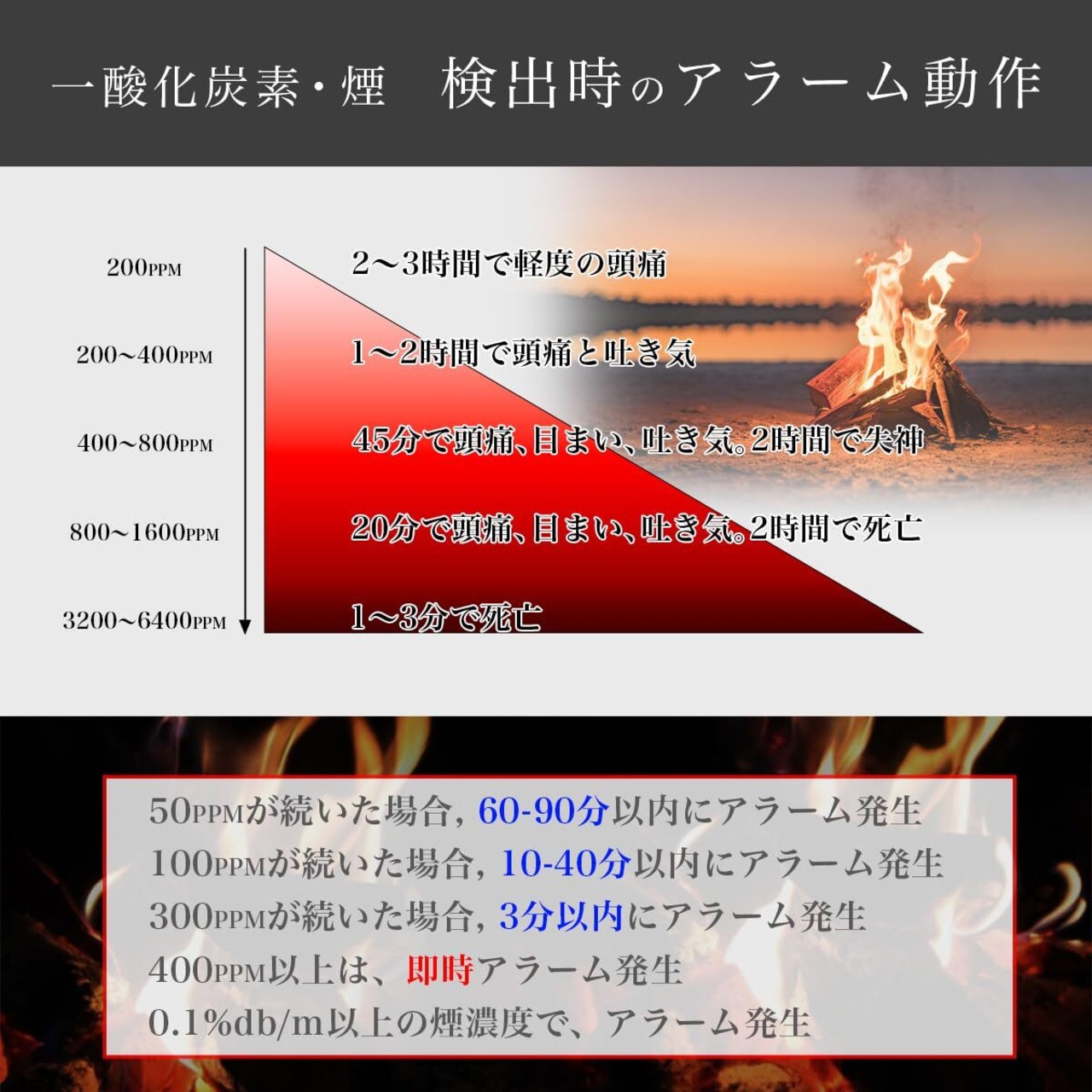 【1台2役◆一酸化炭素警報機と火災警報器機能搭載】一酸化炭素だけでなく、火災等で発生する煙も検知します。秋冬キャンプではテントで焚火など暖房器具が設置される機会が多いので、煙と一酸化炭素を検出する当製品は重要なセーフティアイテムとなります。一酸化炭素は無色無臭なので検知が難しいですが当製品は高感度センサーを搭載し、一酸化炭素の濃度が危険なレベルに達するとアラームが鳴ります。同時に煙を検知して早期に火災を察知し危険から守ります。安心してキャンプを楽しむために、この多機能な警報機をお役立てください。