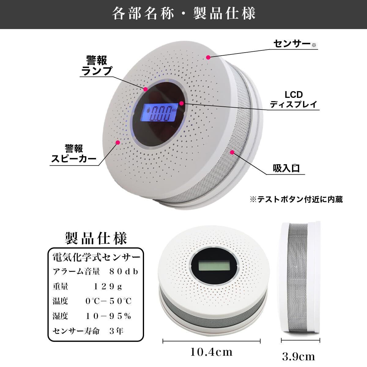 【1年保証】保証期間はお買い上げ日より1年間です。本製品は一酸化炭素と煙のみを検知します。