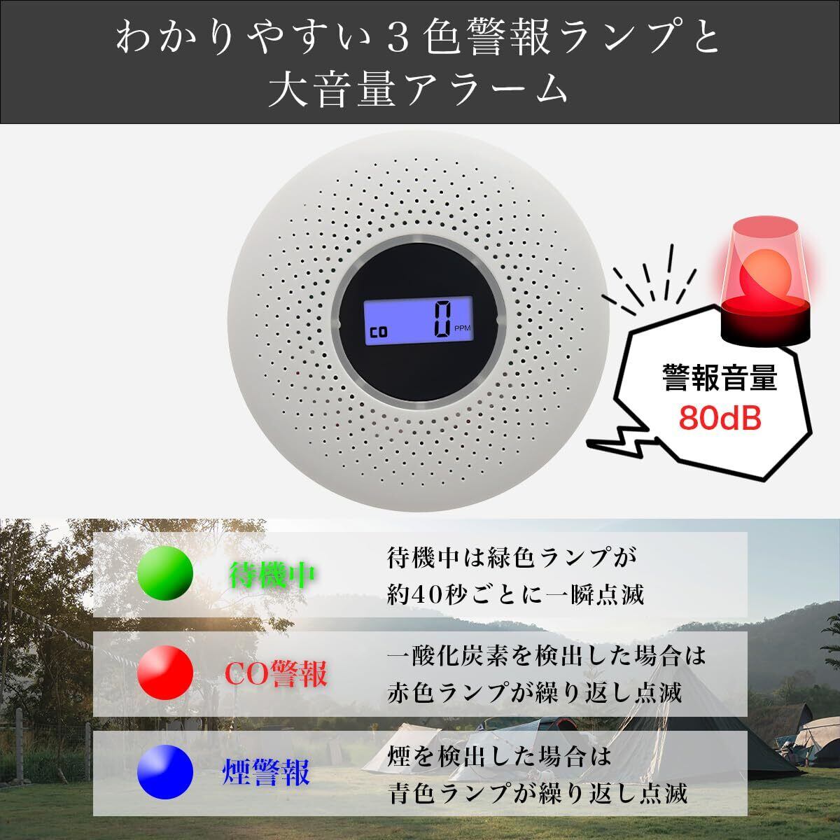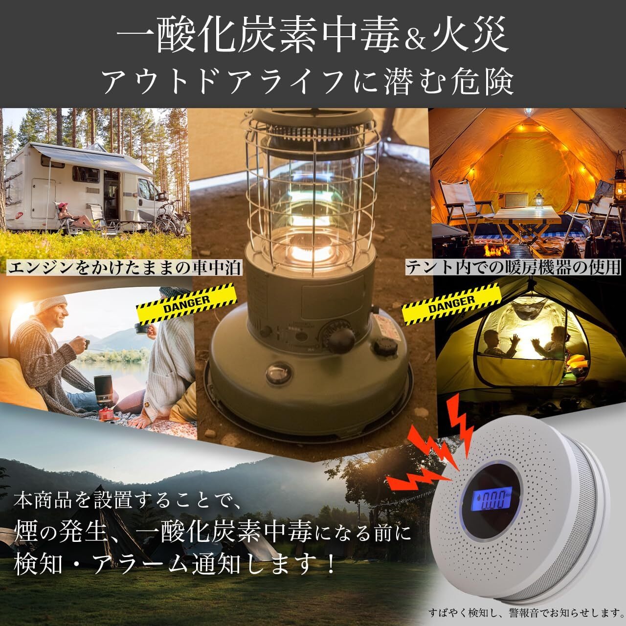 【アウトドアに最適】秋冬キャンプ・車中泊など、さまざまなシーンで利用可能です。ガスストーブ、石油ストーブ、焚火ストーブ、炭ストーブ、自動車のエンジンなど燃焼器具を利用する場合には、一酸化炭素中毒から身を守るためにぜひご利用ください。