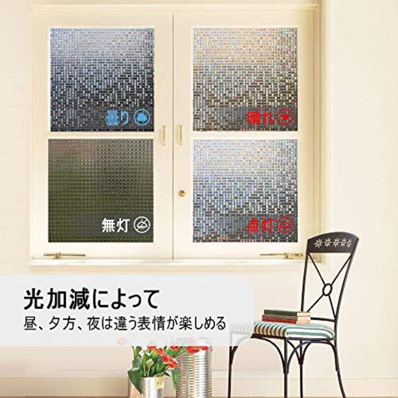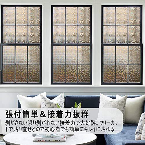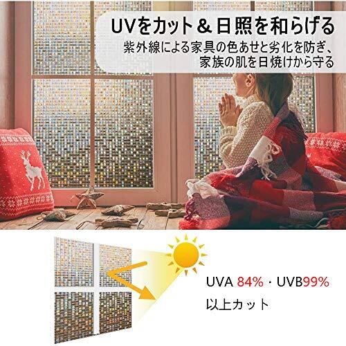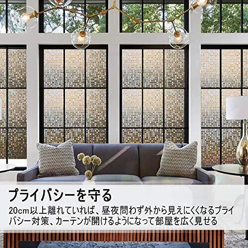 目隠し・日射調整・UVカット:天気や昼夜を問わず、20cm以上離れていれば、室内が見えにくく!また、 UVA 84%・UVB99% 以上カットし、明るさを保ちつつ、内装を保護します。カーテンとさらば!浴室など近距離での目隠し効果が大事なところにはお勧めしません。要注意:設置の成功は使い方次第です。