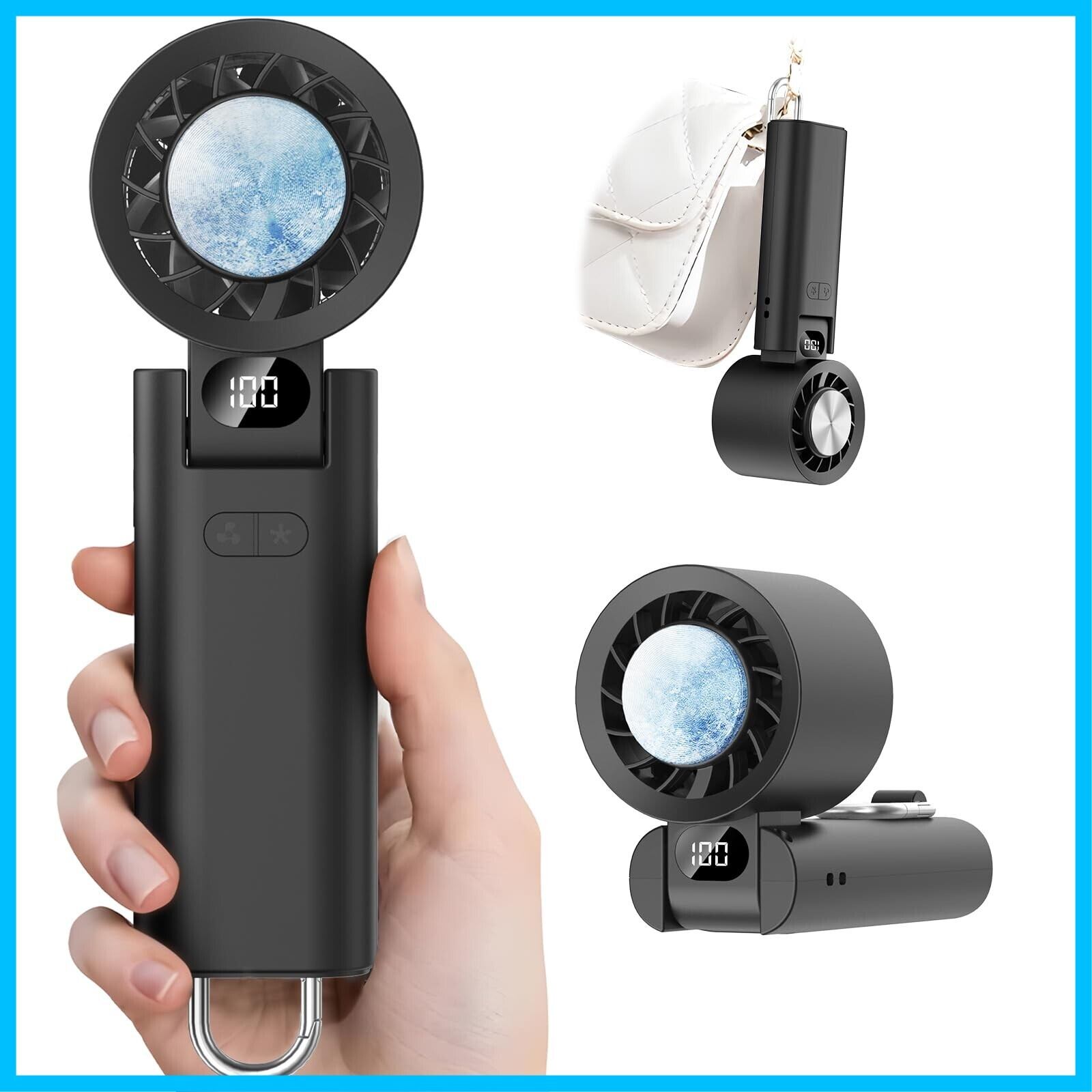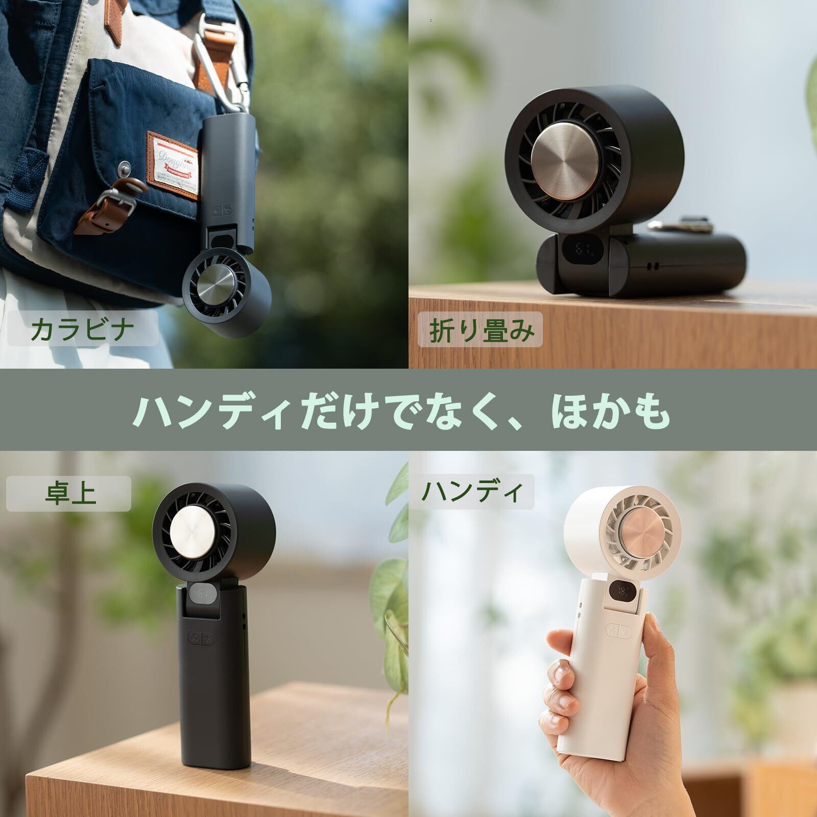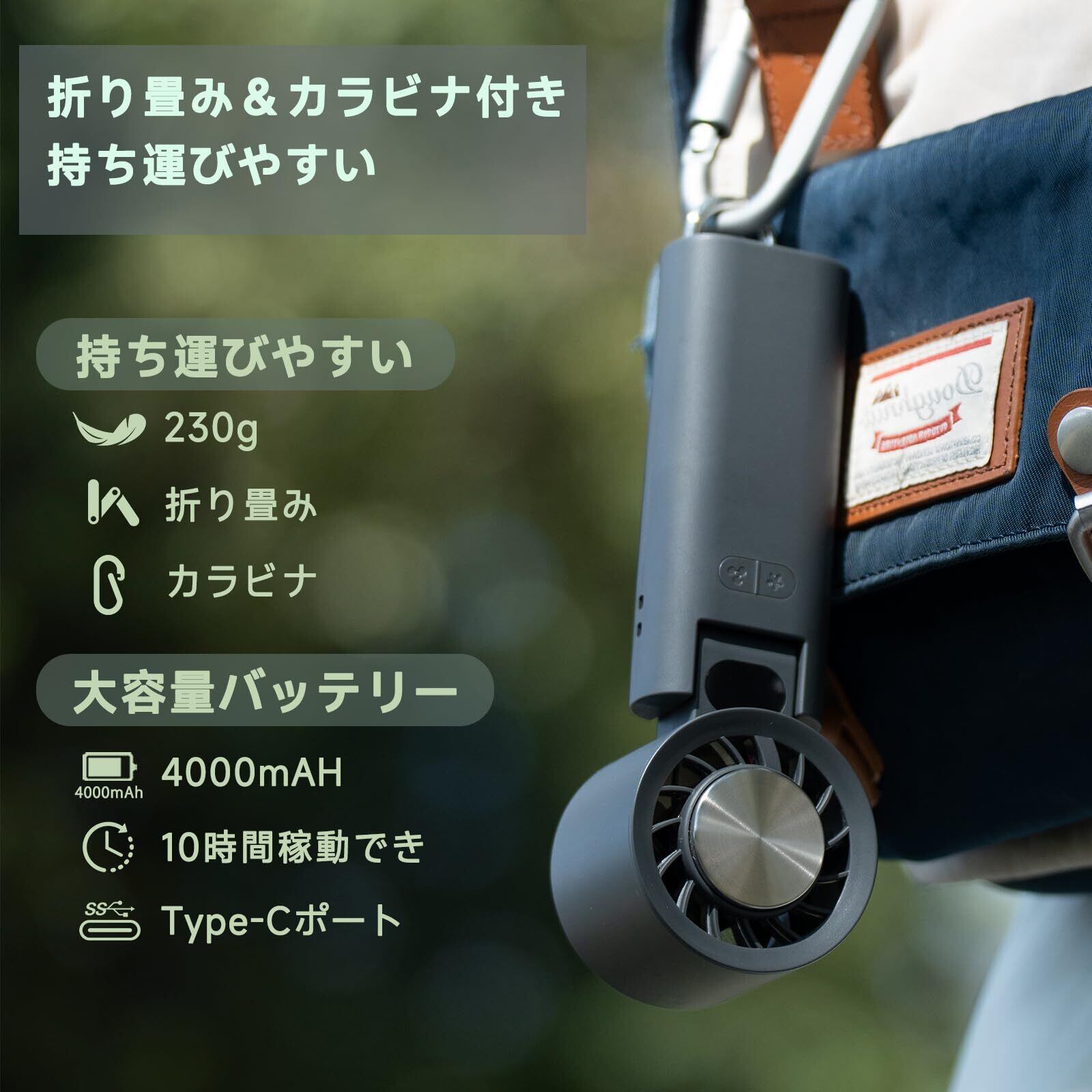 【カラビナ&折り畳み ハンディファン】本体は135度折り畳み可能で、鞄のポケットにもすっぽり収納できます。付属のカラビナ付きで、リュックなどに簡単に取り付け可能があります。外出先でも手軽に使える、機能性と携帯性の両立を追求しています。