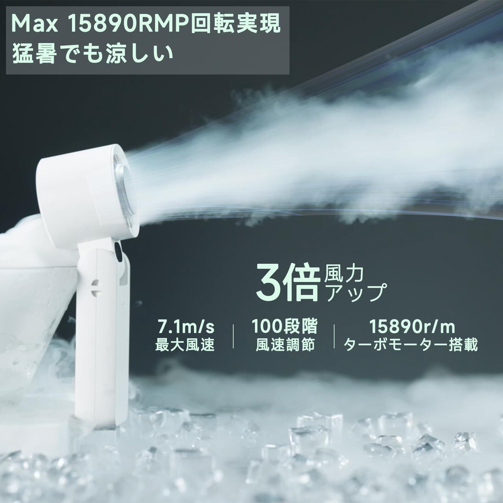 【爆風 携帯扇風機】高速モーター採用により、強力な風を実現します。風量が100段階で調節可能なため、オフィスのデスクからジムでのトレーニングまで幅広く対応します。「そよ風」から「強風」まで、シーンにぴったりの風量を自由に選べます。