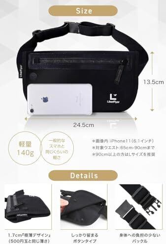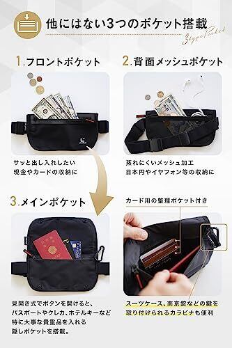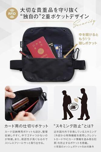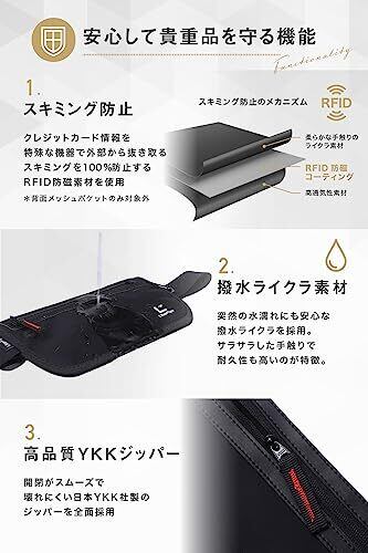 【薄くて軽くてしっかり隠せる】:1.3cmの薄型設計のため服の中にも隠しやすく、外からも着用が分からない防犯スマートデザイン。 【貴重品を守るための設計】:(1)スキミング防止機能(※フロントとメインポケットが対象、背面メッシュポケットは対象外)(2)撥水性の高い高級ライクラ素材(3)高品質YKKジッパー を採用し、使うたびにその安全で快適な機能性を実感できるスペックに。