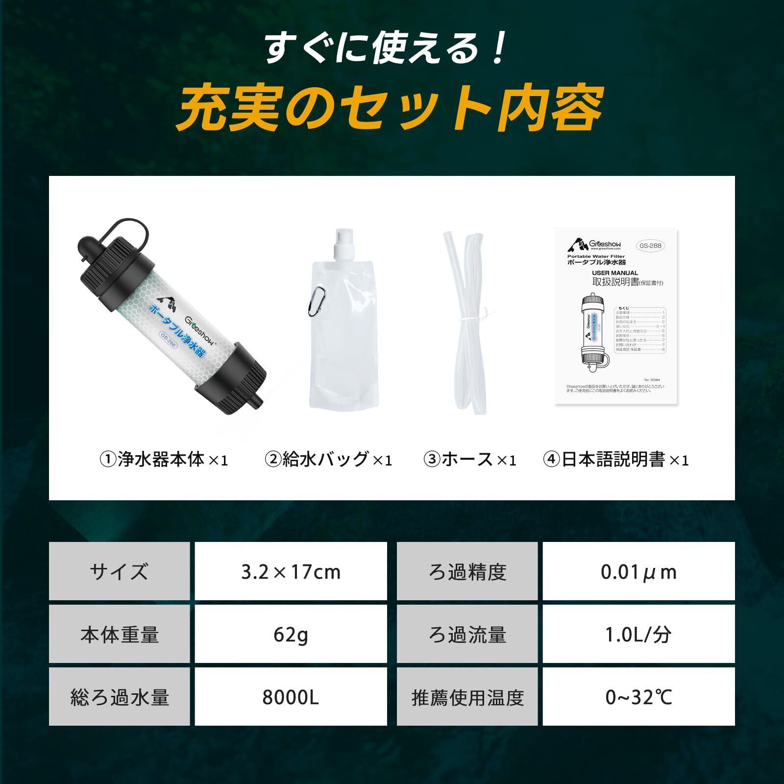 Greeshow携帯浄水器 8000L浄水量 アウトドア・防災 濾過器 キャンプ・登山・地震対策 中空糸膜 フィルター交換不要 軽量コンパクト 非常用防災グッズ