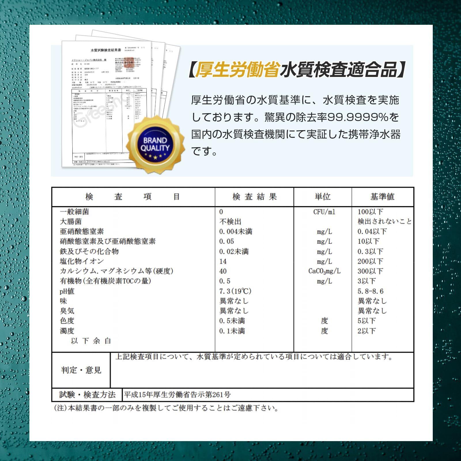 【厚生労働省認定の安全性】Greeshow携帯用浄水器は、厚生労働省の水質基準に適合し、99.9999%の除去率を実証済み。水道水や川の水を安心して飲める清潔な水に変えます。ミネラルを保持しつつ、雑菌を完全に除去できるのはGreeshow浄水器だけの特長です。