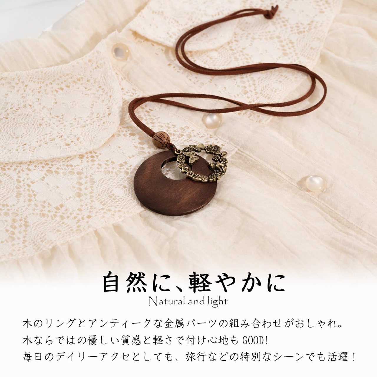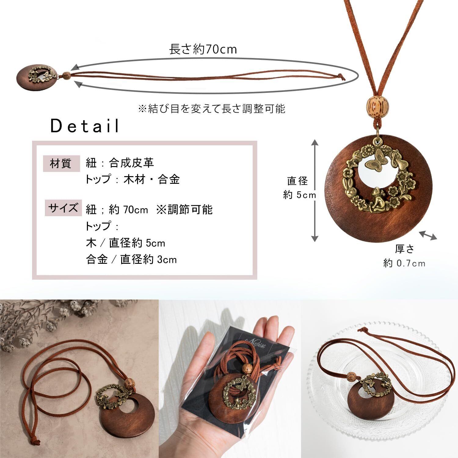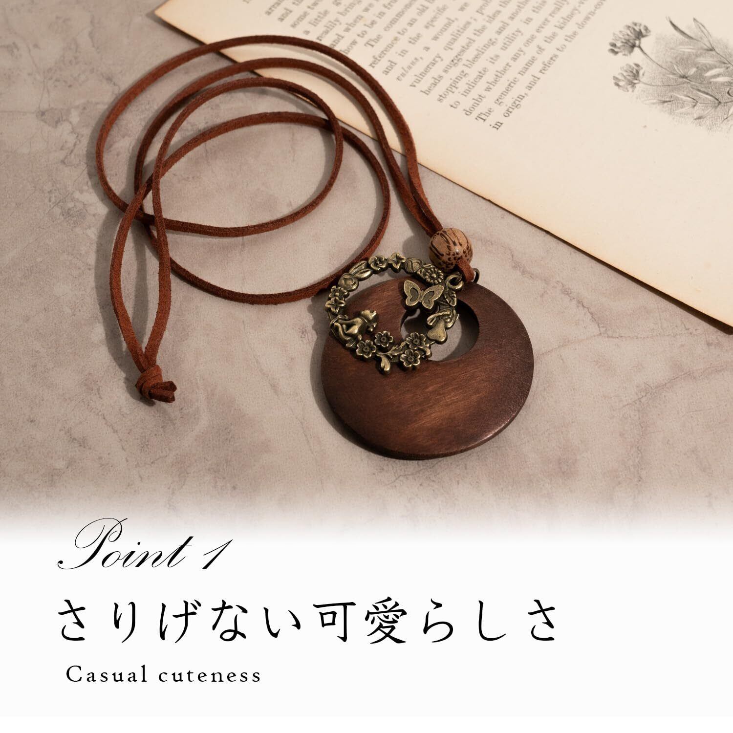 【商品について】お花畑で遊ぶかわいらしい猫のメタルパーツと、優しい風合いのリング型ウッドパーツを組み合わせたロングタイプネックレス。木と革ひもの風合いがナチュラルな印象。シンプルなトップスと組み合わせてファッションのアクセントに。革ひもは滑らかで柔らかい素材の合成皮革を使用。肌触りが良く、丈夫なのが特徴です。