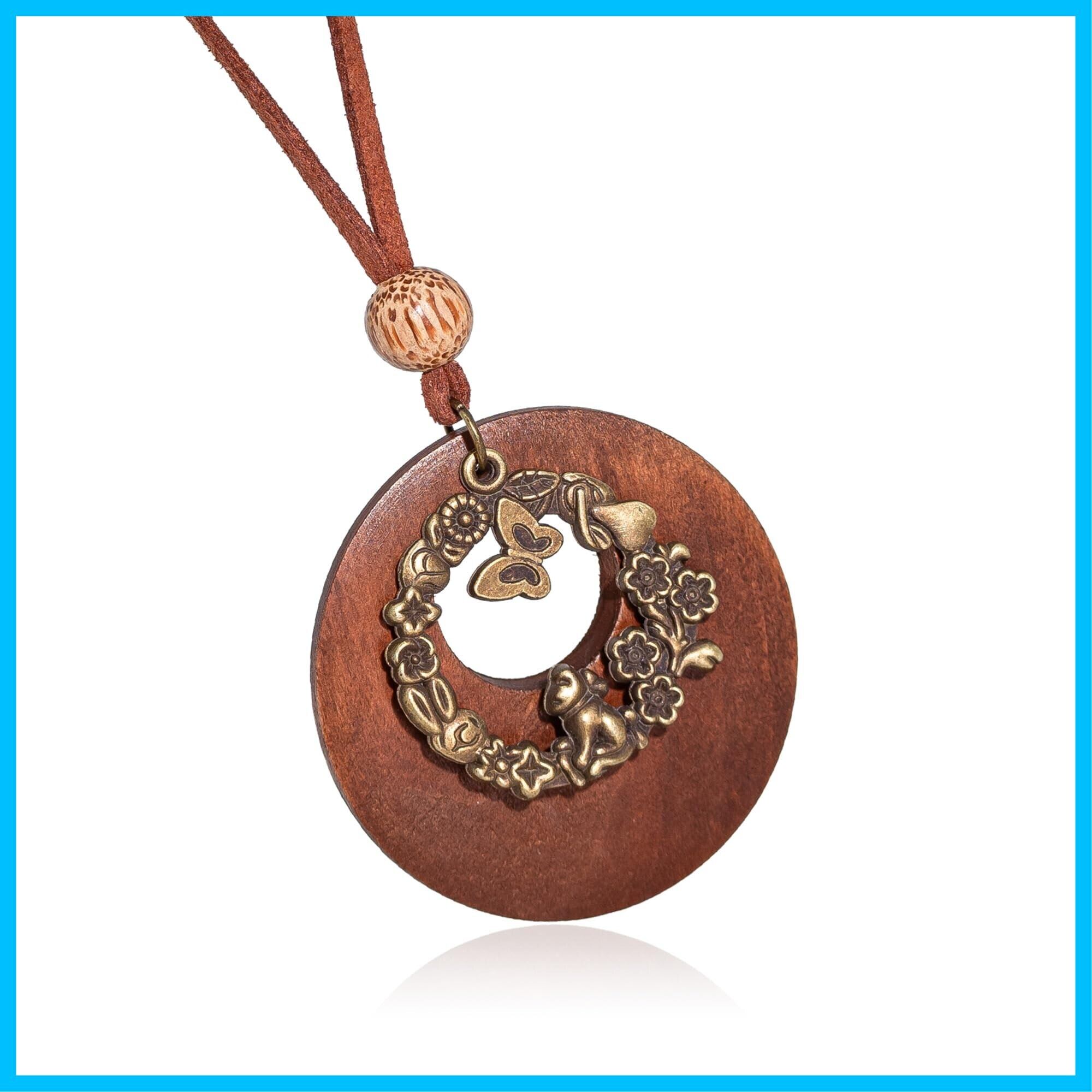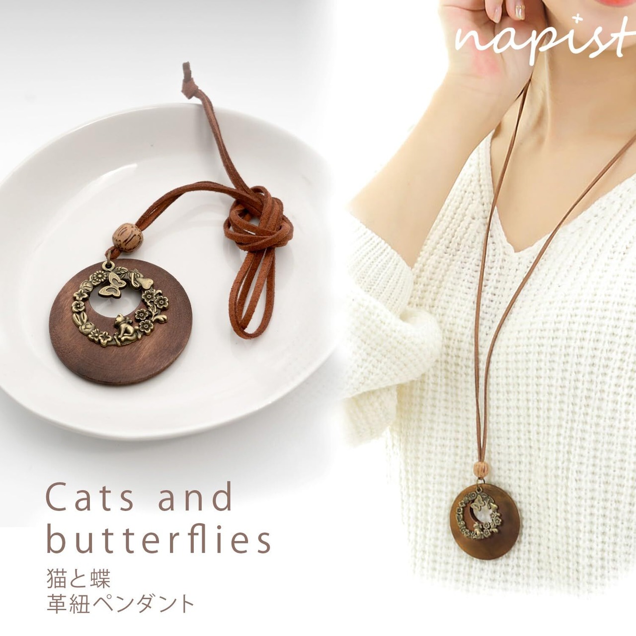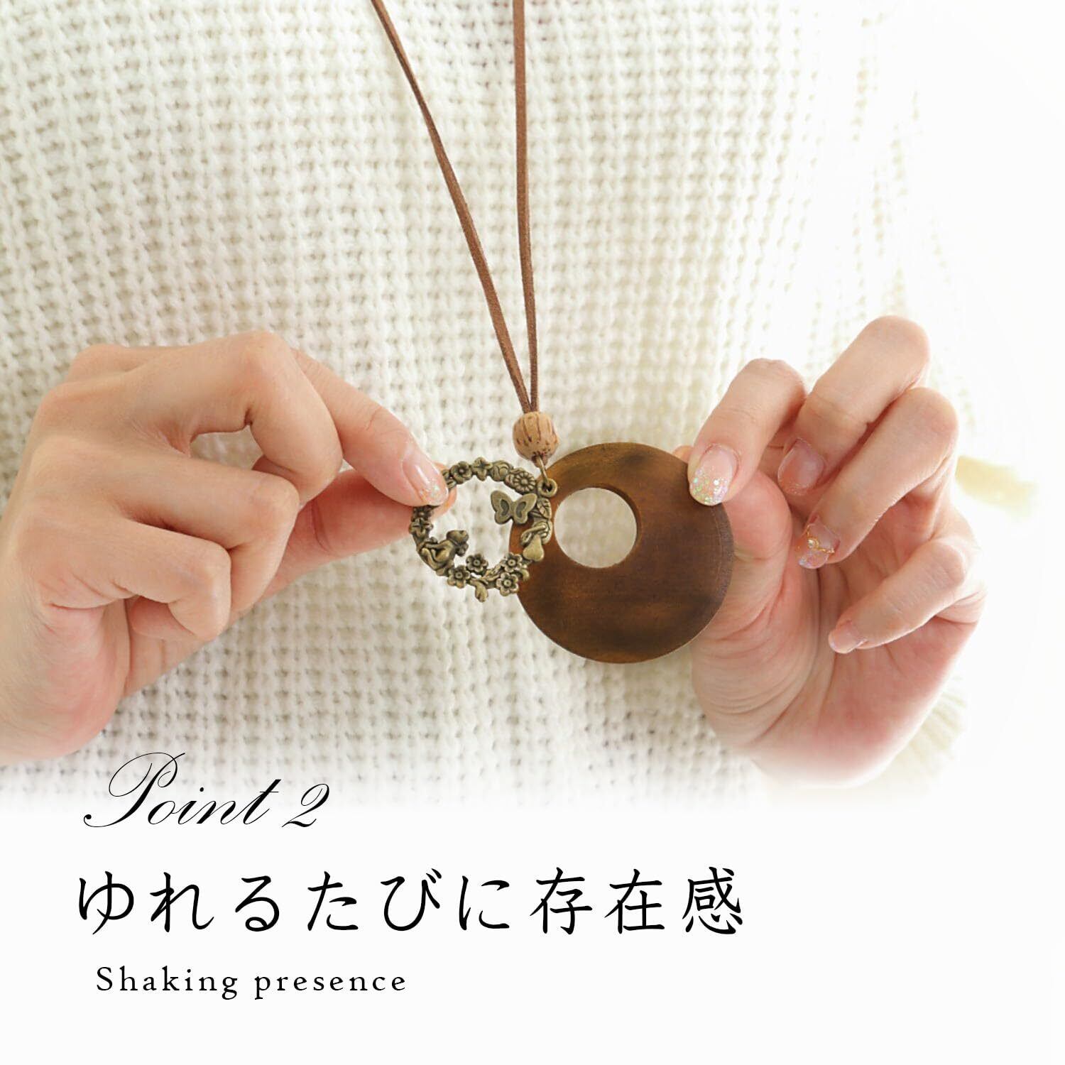 【商品について】お花畑で遊ぶかわいらしい猫のメタルパーツと、優しい風合いのリング型ウッドパーツを組み合わせたロングタイプネックレス。木と革ひもの風合いがナチュラルな印象。シンプルなトップスと組み合わせてファッションのアクセントに。革ひもは滑らかで柔らかい素材の合成皮革を使用。肌触りが良く、丈夫なのが特徴です。
