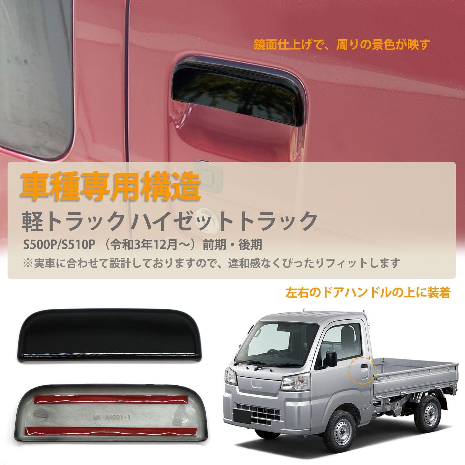 【車種専用】軽トラックのハイゼットトラック用 型式S500P/S510P(2021年12月~) に専用ドアハンドルカバーです。実車に合わせて設計しておりますので、違和感なくぴったりフィットします。