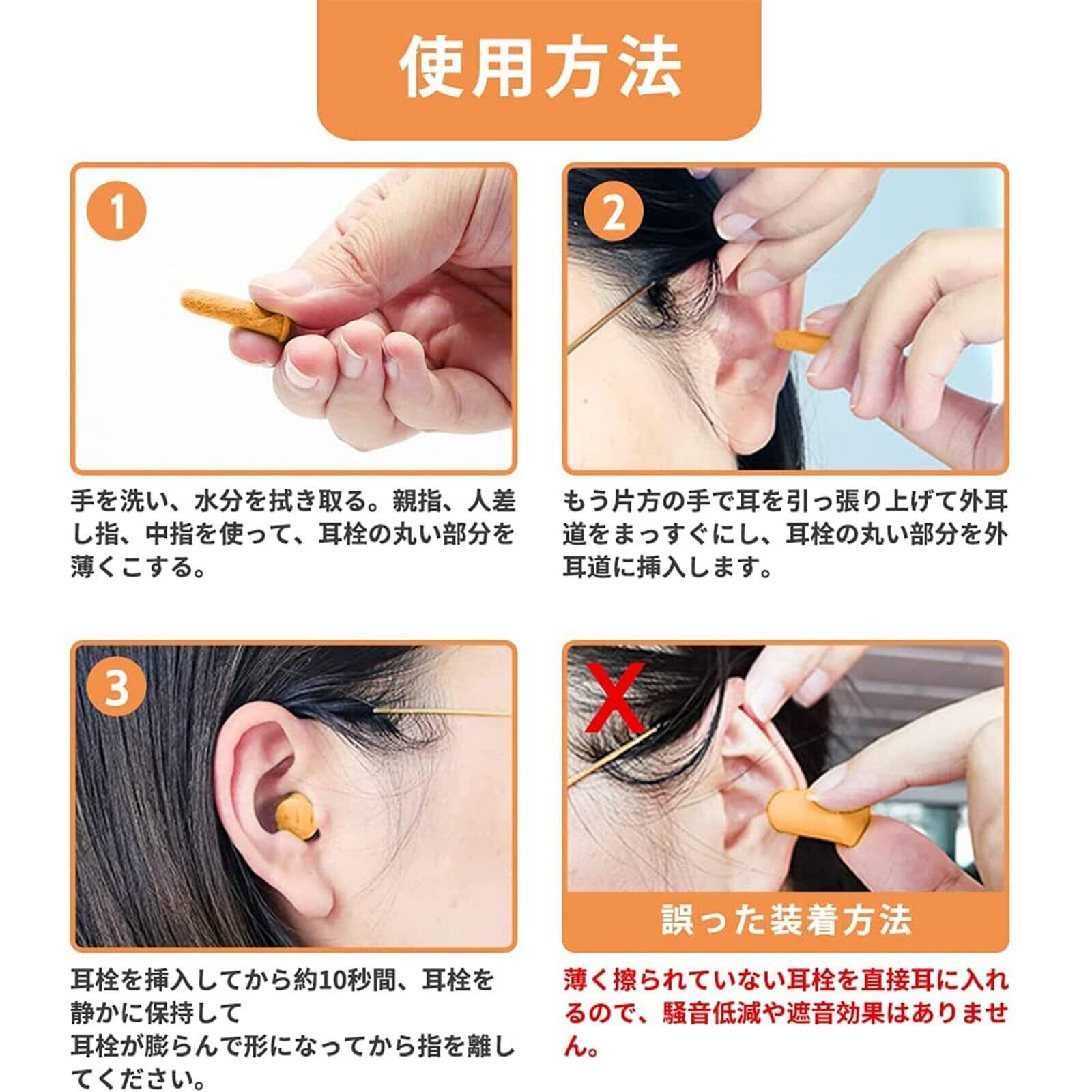 このソフトなフォームイヤープラグを使用の時、指先で丸めて、細くさせてから耳に入れます、60秒でゆっくり膨らみ、外耳道に完全に合わせることができます。