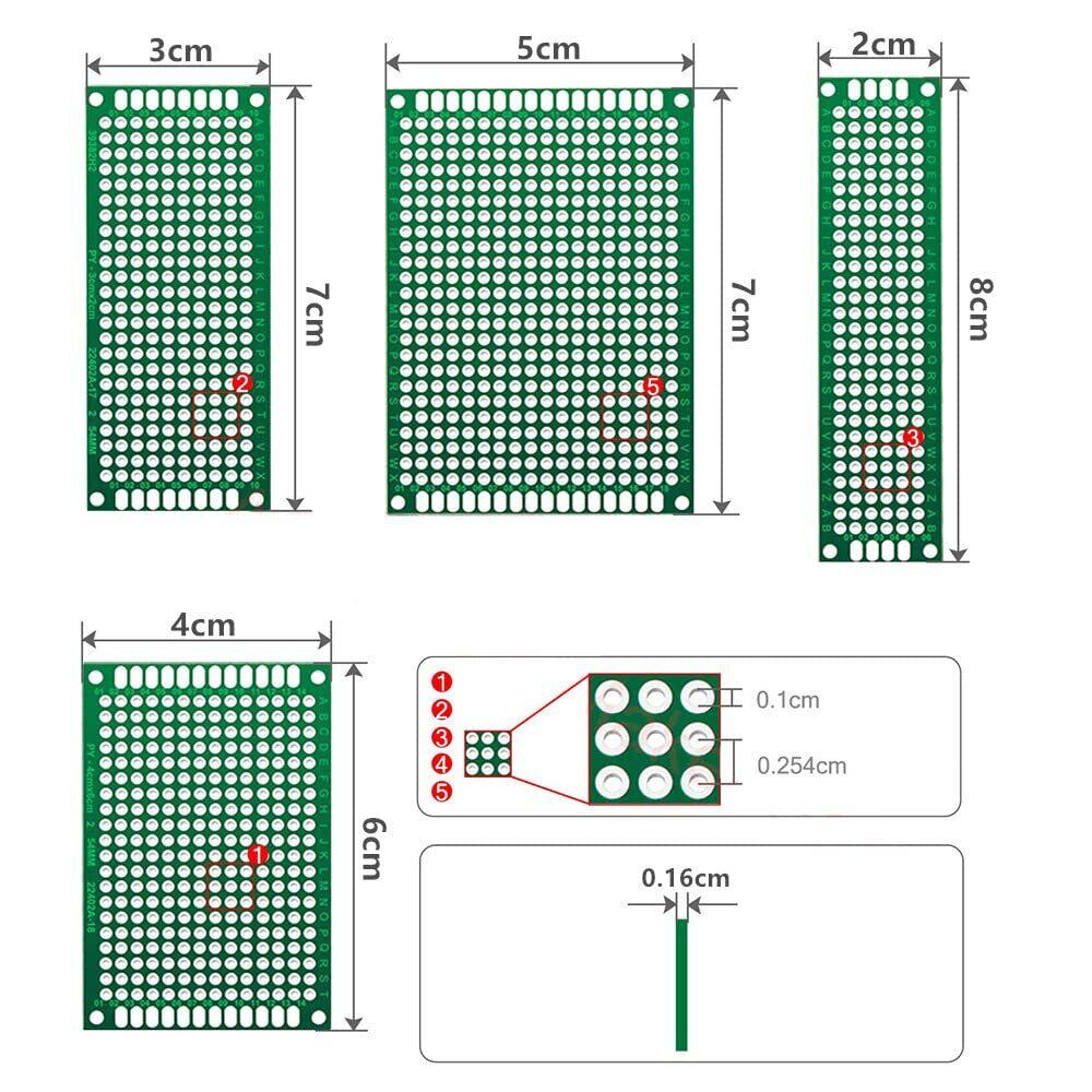 四種類 サイズ:2*8CM 、3*7CM、4*6CM 、5*7CM、 各サイズ5個(20個セット)素材:FR-4(ガラス繊維)。絶縁性、耐熱性にたいへん優れて、非常にしっかりと丈夫な回路基板です。