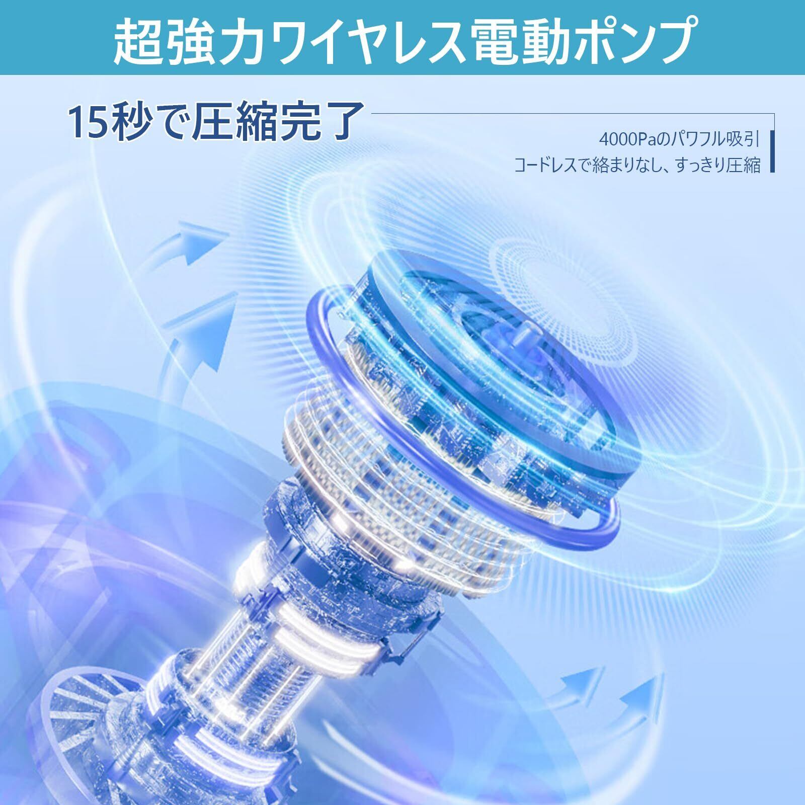 【高圧縮力で荷物をスマートに整理】 150L/minのポンプ速度と4000Paの圧力により、衣類や布団を効率よく圧縮。これにより、収納スペースを大幅に節約し、荷物をスリムにまとめられます。
