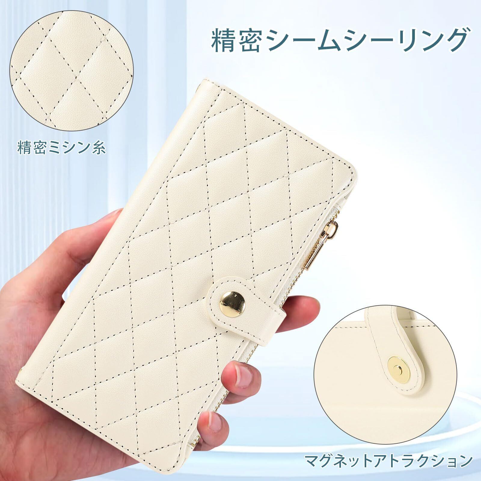 iPhone 15 用 ケース 手帳型 アイフォン15 ケース ショルダー スマホケース 対応 iPhone 15 ひし形柄 いphone15 ケース 人気 女性 肩掛け カード収納 ジップ付き財布 横置き機能 シンプル お洒落 携帯カバー(パールホワイト)