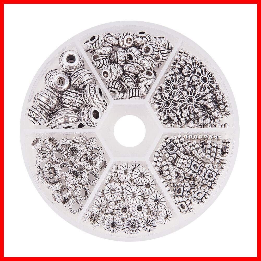 PH PandaHall 約216個入り 6種類 メタルビーズ 古銀色 合金 スペーサービーズ 菊座 花座 座金 チャーム チベット風 ジュエリー製作 アクセサリーパーツ DIY用 クラフト ブレスレット ネックレス 手作り素材 シルバー