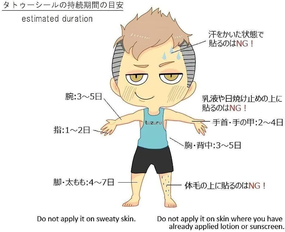 貼り付けたいタトゥーシールを切り取り、表面の透明保護シートを剥がし貼り付けたい箇所の汗や油分と取り除き、絵柄を肌面に触れるように台紙ごとタトゥーシールをのせて軽く押し付けます。水分を含んだスポンジなどで上から抑えながら十分に濡らし、2~30秒ほど待ちます。台紙をゆっくり剥がしていき余分な水分をとり乾けば完成です。