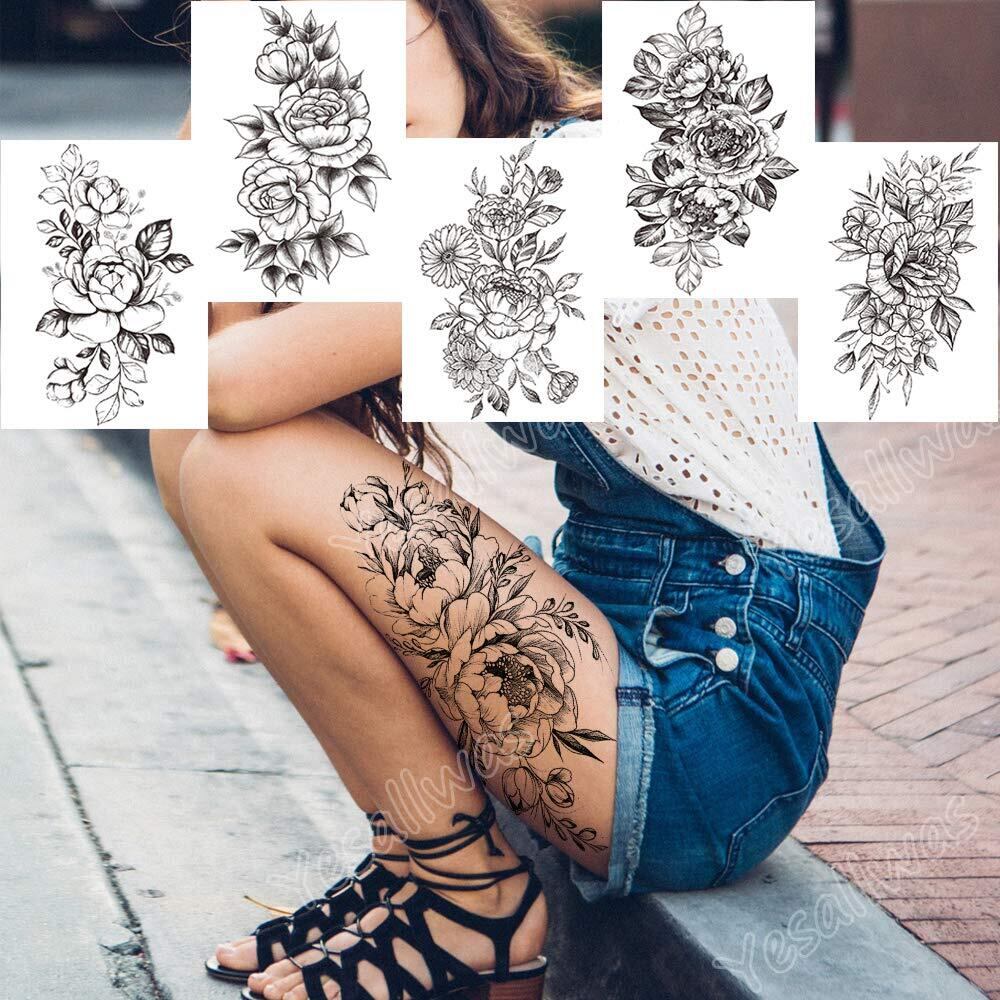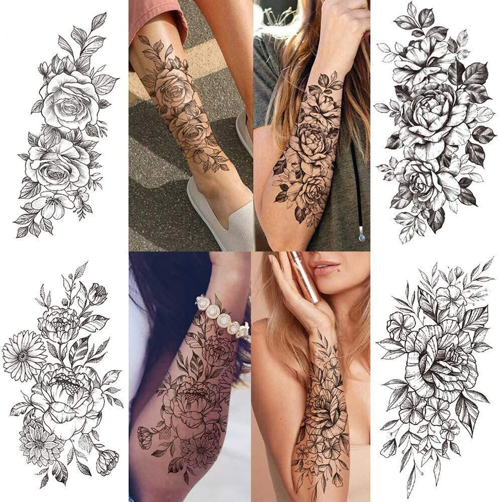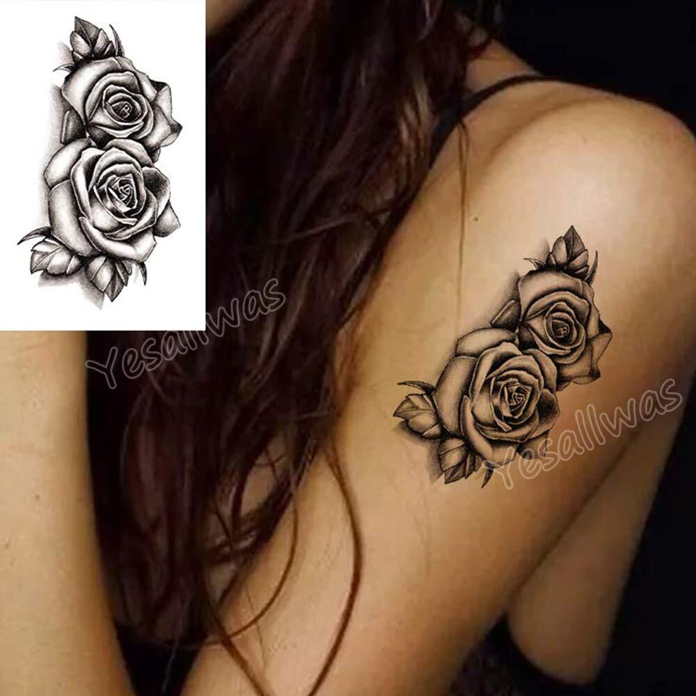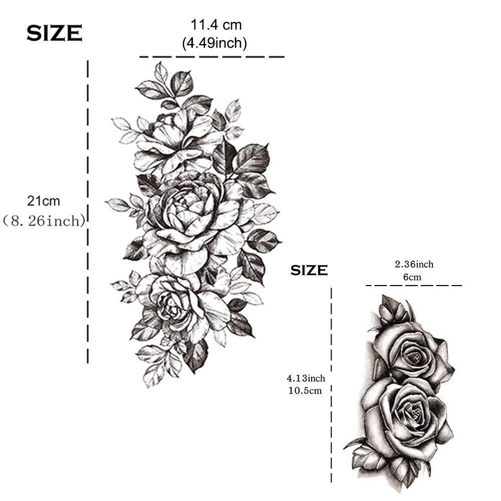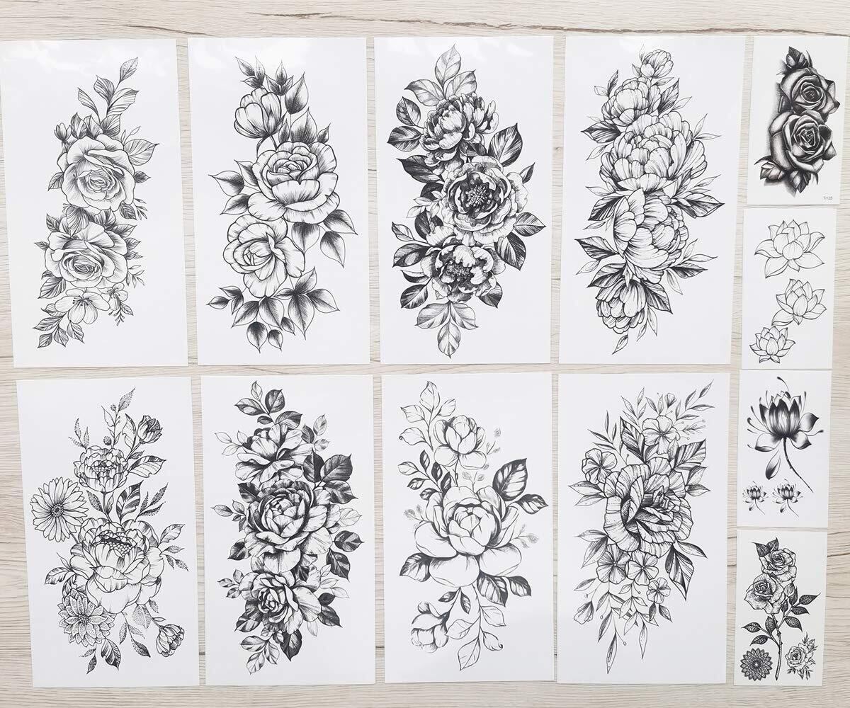 Yesallwas タトゥーシール 花 黒 薔薇 バラ 12枚セット 入れ墨シール リアル 防水 長持ち 刺青シール ボディーシール メンズ レディース black rose flower temporary tattoos 11.5x21CM