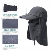 3WAYの機能的な日よけ帽子です。キャップのサイドと、フェイスカバーはメッシュ生地で通気性良好です。頭にこもる熱を逃し蒸れを緩和します。抗菌、耐熱性、抗UVは、クールな感じ。