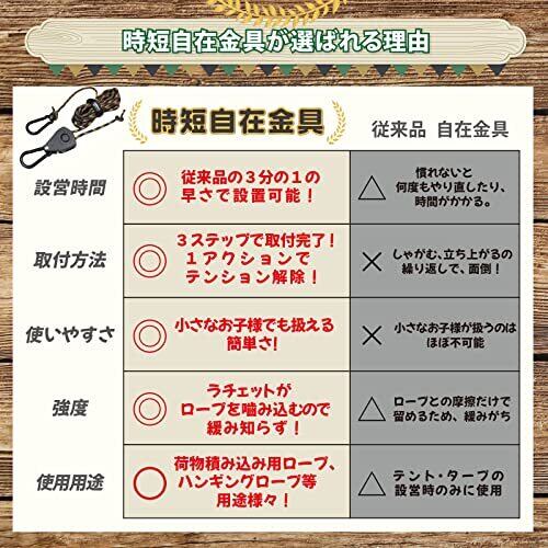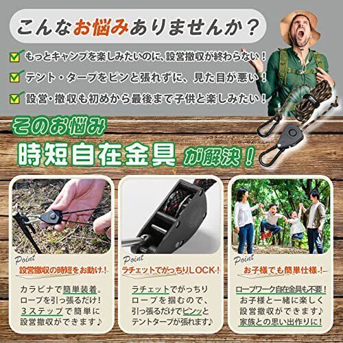 【超簡単仕様】力不要で、手元の作業でテントやタープのロープにテンションを掛けられるので、お子様や女性でも簡単に使用できます。お子様と一緒にキャンプ設営をお楽しみいただけます。きっと良い思い出作りのお役に立てるはずです