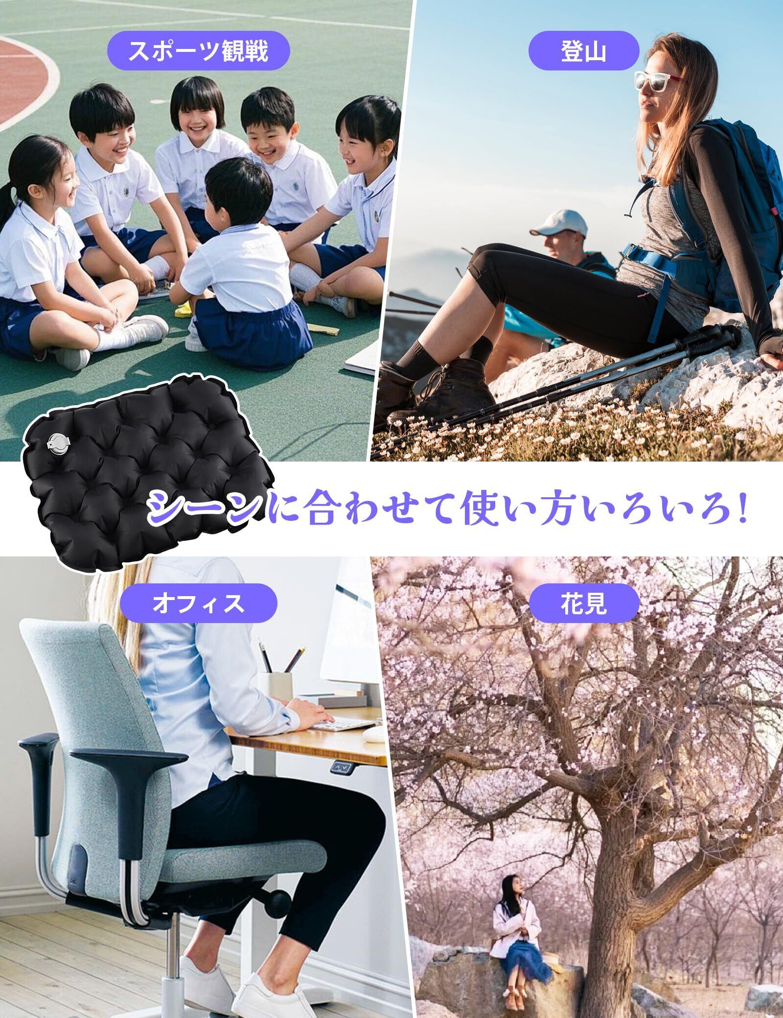 「幅広いシーンで活用」当社のエアー座布団は屋内外でも使用できます。室内でチェアと一緒に使っても違和感がない。持ち運びが簡単なので、公園にキャンプや山登りや釣りなどのアウトドアに最適。運動会、花火大会や花見などの用途にもおすすめします。