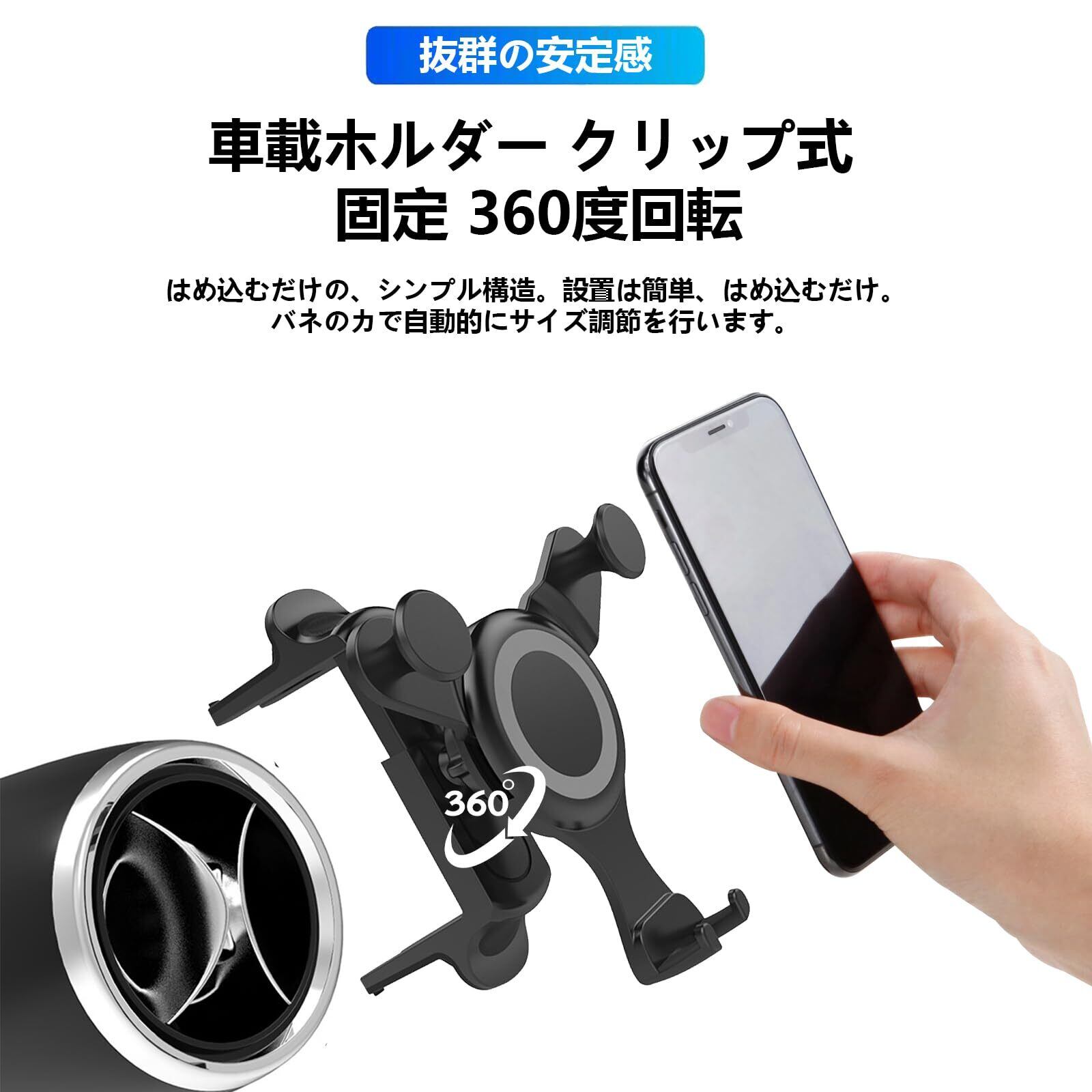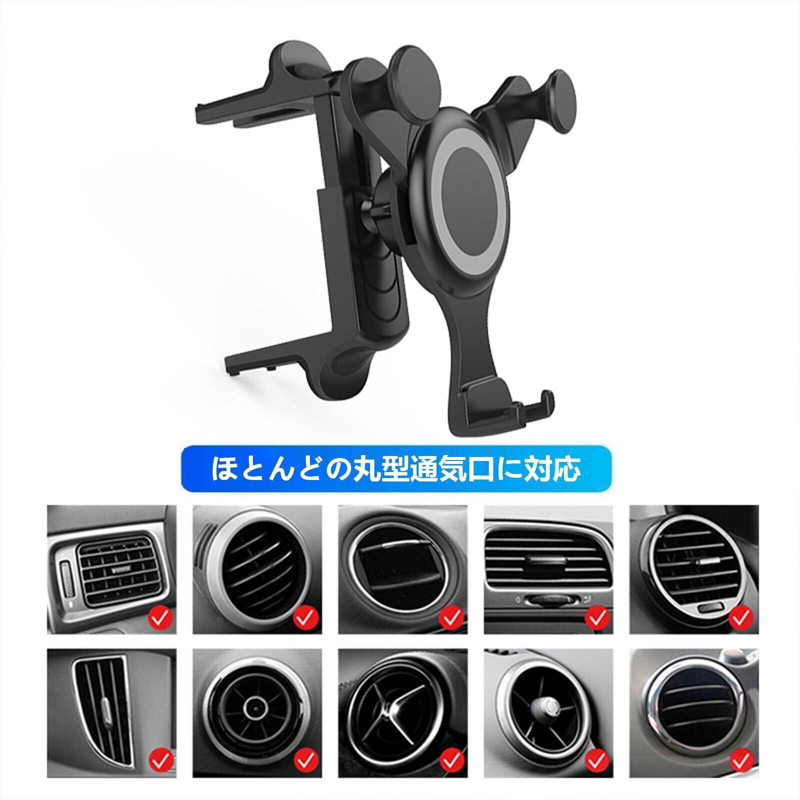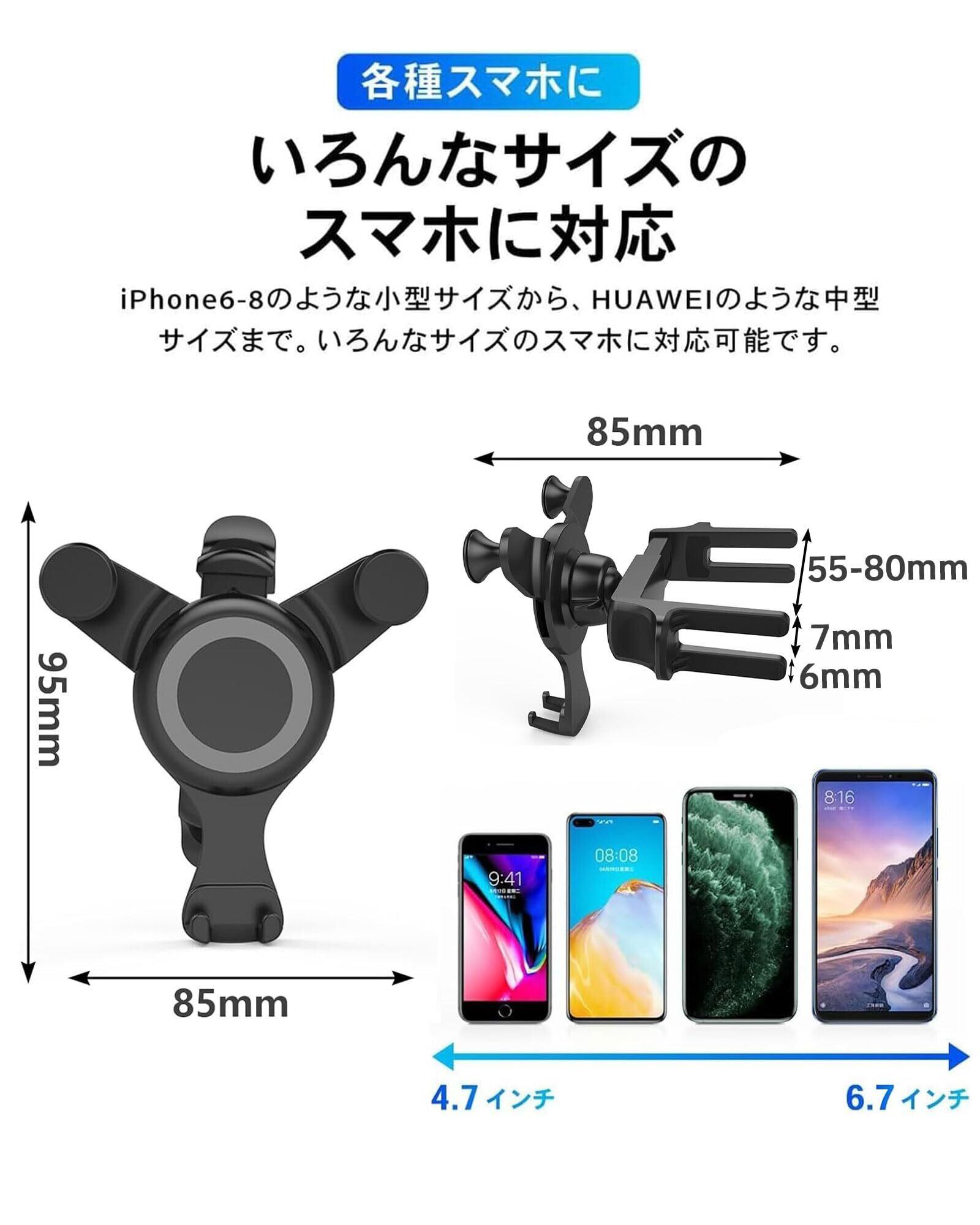 【製品詳細・ご注意下さい】材質:PC+TPE、ABS・本体サイズ:95×85×85mm・設置方法:専用クリップで、車内エアコン吹き出し口に設置。--- カラー:ブラック・適応スマホサイズ:4.7-6.7インチ。--- 適応内エアコン吹き出し口:幅 5.5-8cm。クリップの厚さは0.6cm、クリップ間の距は0.7cm※必ずお車のサイズ形状をご確認ください。