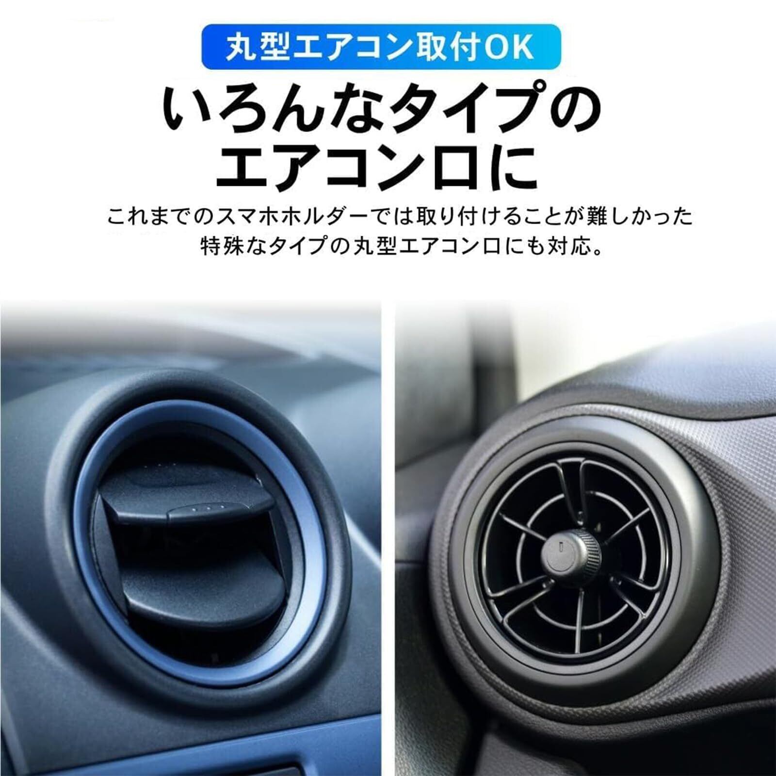 【丸型エアコン取付OK・抜群の安定感】抜群の安定感で、きっちり固定。ラウンドタイプのエアコン吹き出し口にも対応。エアコンロにしっかり取り付き、強力アームがスマホをキープ。あらゆるシーンにお応えします。いろんなタイプのエアコンロに。これまでのスマホホルダーでは取り付けることが難しかった特殊なタイプの丸型エアコンロにも対応。粘着タイプや吸盤タイプのような跡残りも気になりません。※各種吹き出し口に対応。横型、縦型、丸型、特殊丸型など、いろんなタイプの吹き出し口に取付可能です。