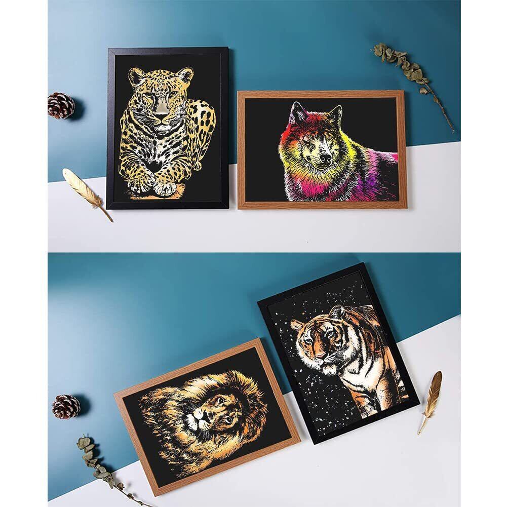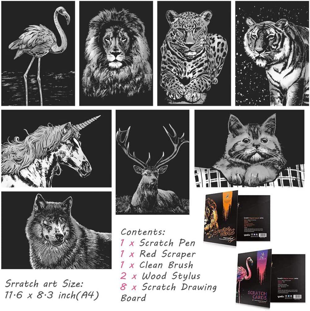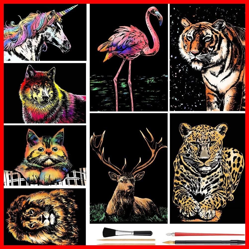 Limspace スクラッチアート スクラッチペンセット付け8枚セット スクラッチペーパー A4サイズ 削るだけで美しいアート ヒーリング 心やすらぐ アートセラピー スクラッチアートペン付き 手作り プレゼント 部屋飾り 夜の花火 都市と建築 人と桜 動物 (動物)