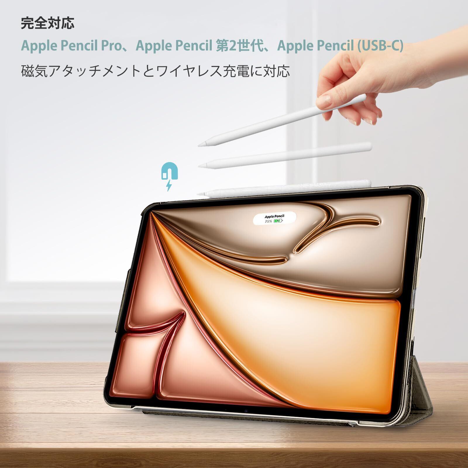 Apple Pencil 第2世代のアタッチメント機能と充電を支持します;マグネット内蔵でオートスリープ/ウェイクに対応しながら、開閉も容易です。