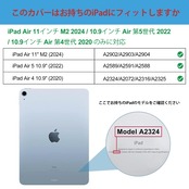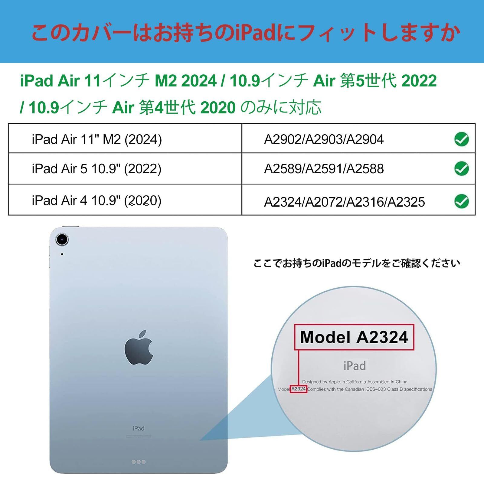 適用機種:iPad Air 11インチ M3 2025(A3267 A3270)、iPad Air 11インチ M2 2024(A2902 A2903 A2904)、iPad Air 第5世代 2022(A2588 A2589 A2591)、iPad Air 第4世代 2020(A2324 A2072 A2316 A2325) 10.9インチ、その他の型式に適用されません。ご購入前、お持ちのiPadのモデル番号をご確認いただきます。