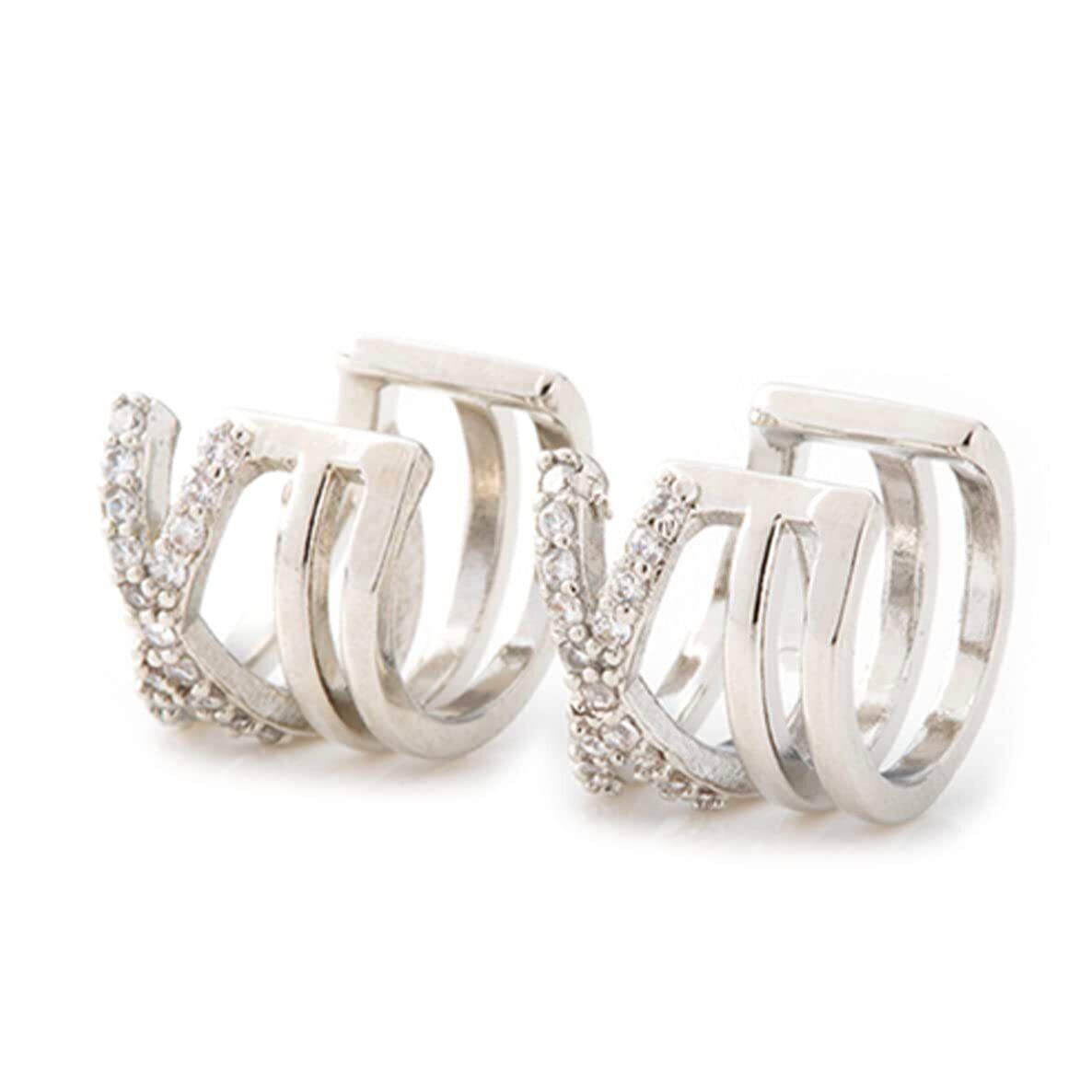 [ALOHAMONI] イヤーカフ 4連 クロスリング & 2連リング ラインストーン フェイクピアス クロス 十字 平行 2連 両耳 2個 イヤカフ 軟骨 フープ イヤークリップ 韓国 オルチャン (シルバー)