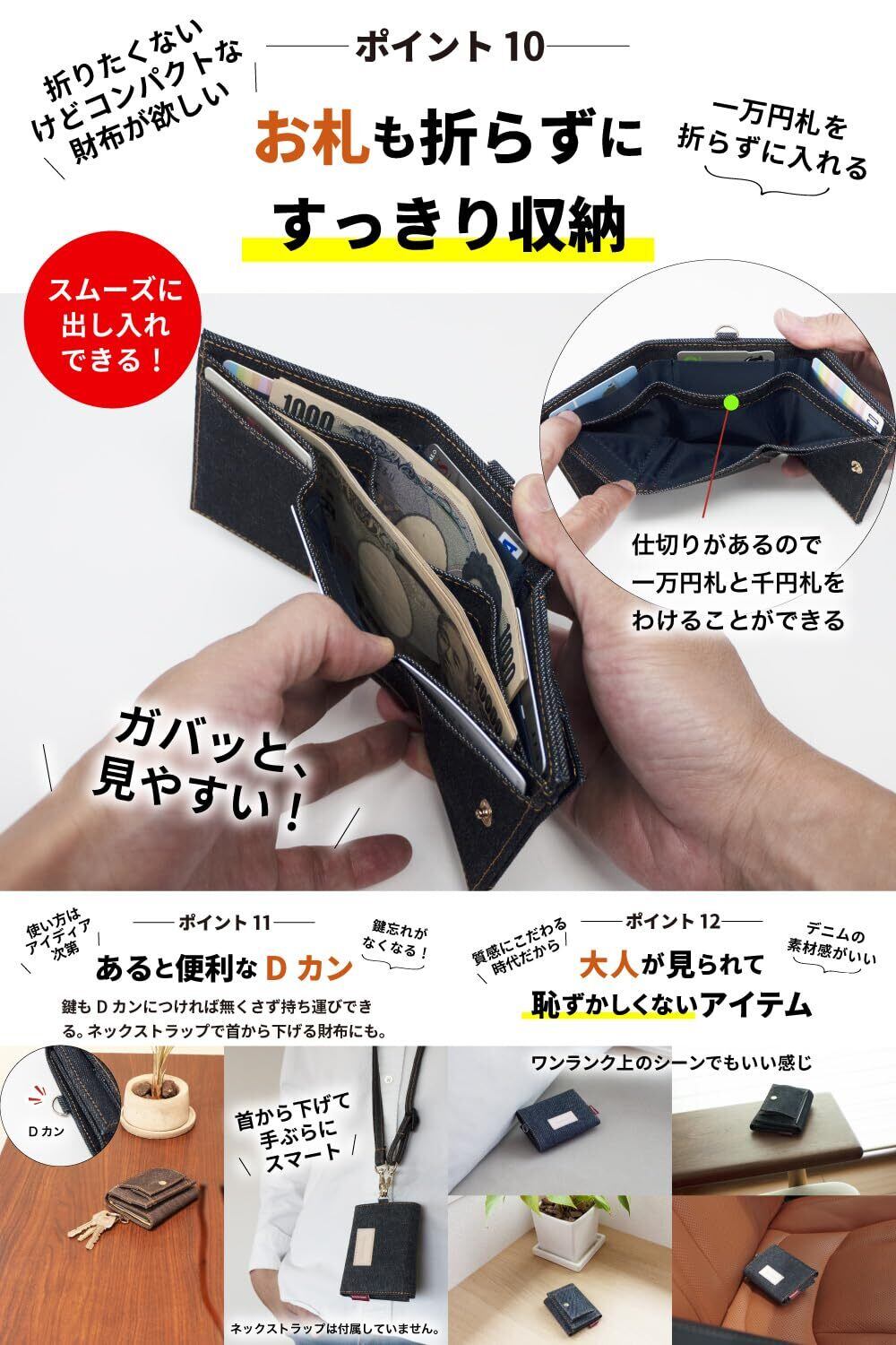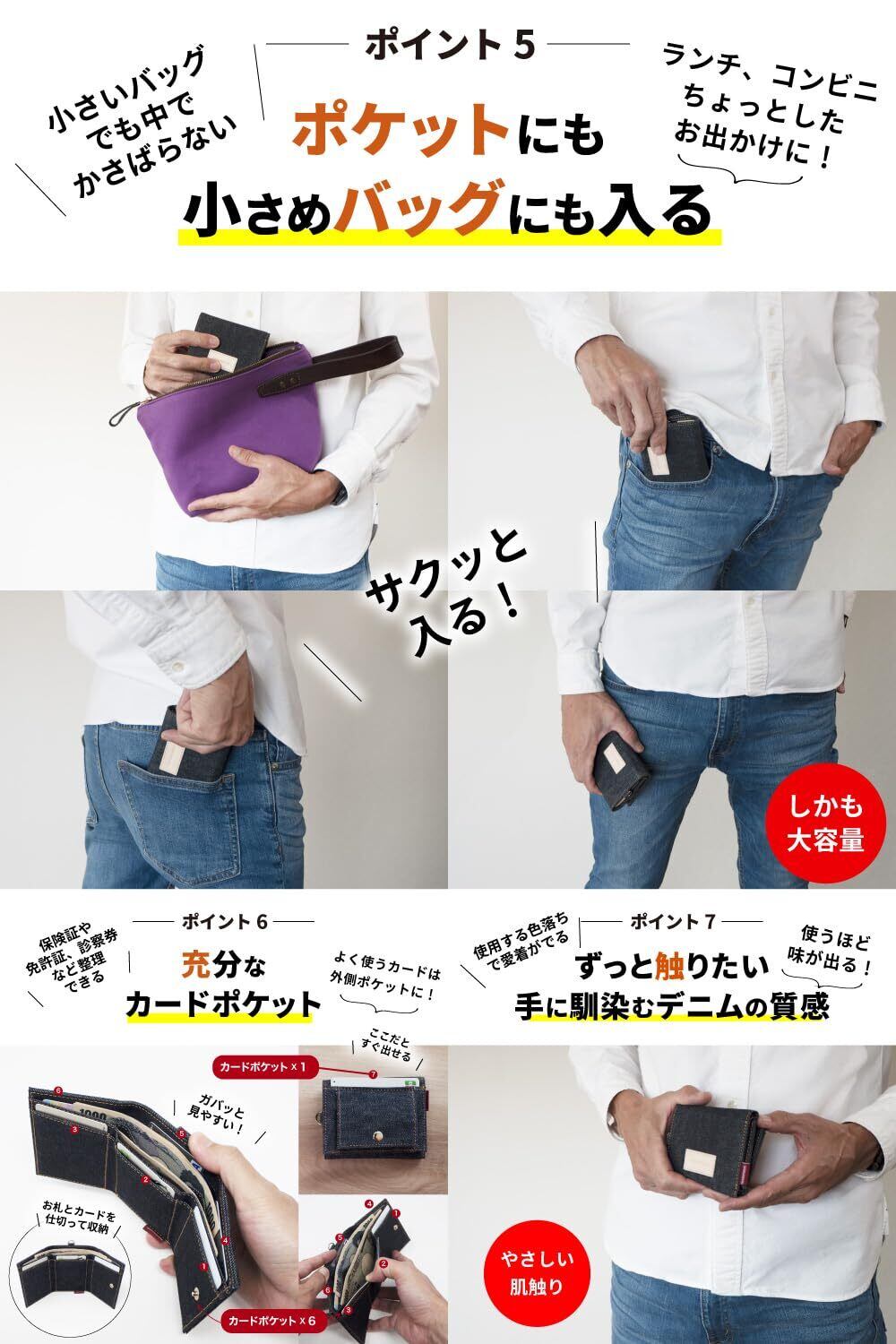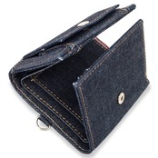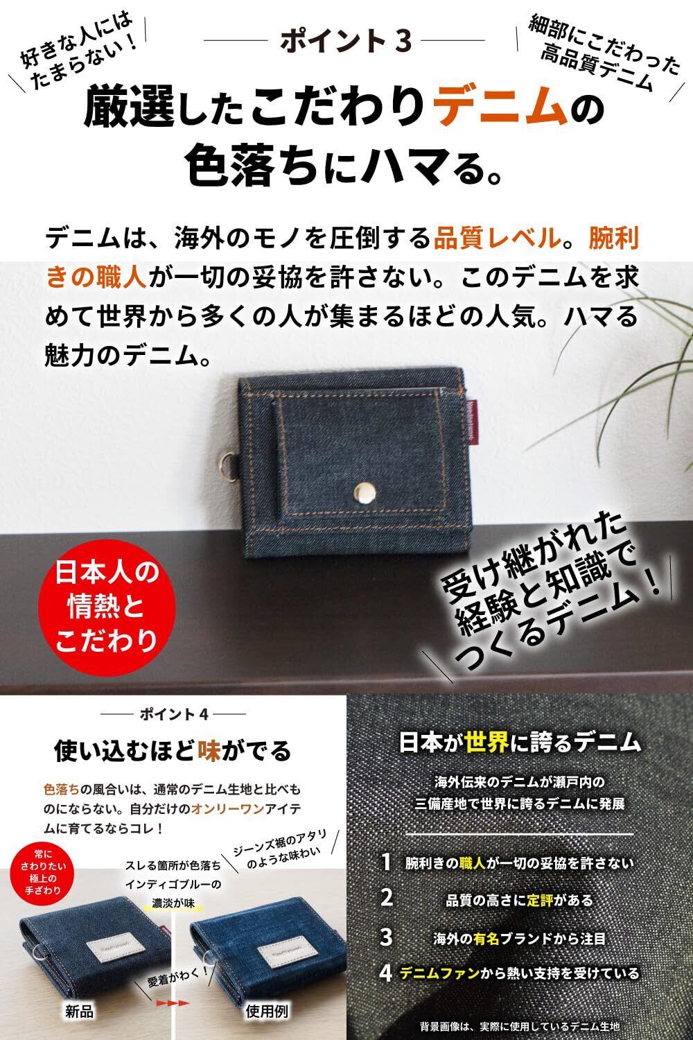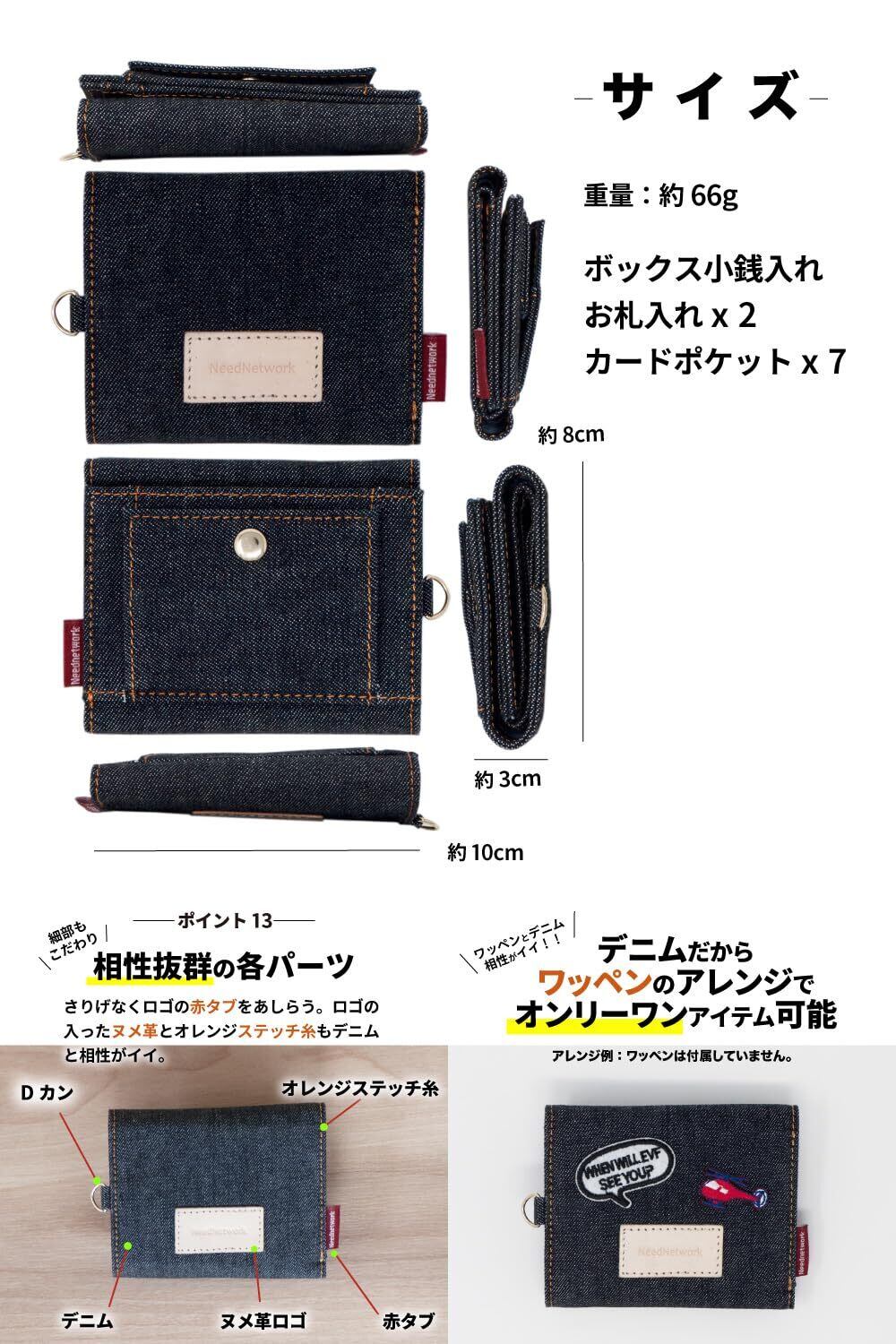 【デニムの魅力にハマる。三つ折り財布】手のひらサイズでコンパクト ▶︎長財布と同等の収納力。入れたいものはちゃんと入る ▶︎お札を折らずにカードと小銭を収納。世界でも名高い日本製デニムから厳選したデニム生地を使用した三つ折り財布 ▶︎この高品質なデニム生地は、海外のモノを圧倒する品質レベル。腕利きの職人が一切の妥協を許さない使い込むほど味が出る ▶︎色落ちの風合いは、一般的なデニム生地と比べものにならない。自分だけのオンリーワンに育てるならコレ。スキミング防止機能 ▶︎大切なデータ情報を守る。小銭入れは大きく開くボックス型▶︎ たくさん小銭も2段ホックで収まる。お札も折らずにスッキリ収納▶︎ 仕切りがあるのでお札を分けることができる。あると便利なDカン▶︎ 首からぶら下げて手ぶらにスマート。相性抜群の各パーツ ▶︎さりげなくロゴの赤タブをあしらう。ヌメ革とオレンジのステッチ糸もデニムと相性がイイ。サイズ、横 約10cm 縦 約8cm 厚さ3cm ■重量、約66g