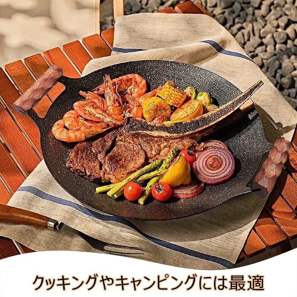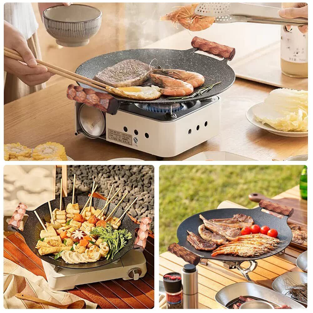 【握りやすい】木製の取っ手はやけどをせずにマルチグリドルを握ることができ、快適なキャンプ体験を全面的にサポートします。