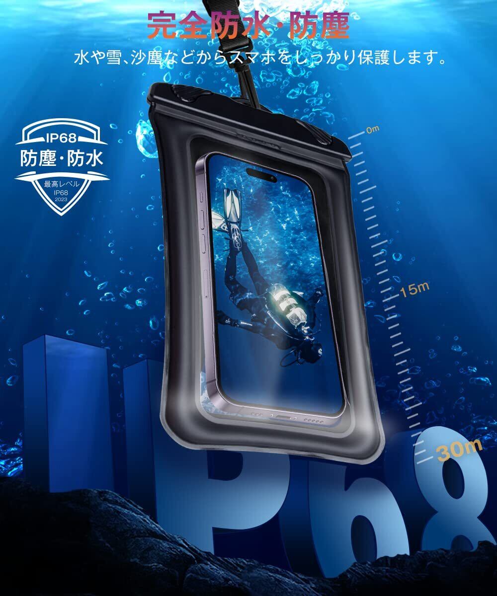 【IP68認証取得!超強防水防塵力】スマホ 防水ケースは防塵・防水国際保護等級のIP68認定を獲得、4層構造で防水、防塵性能を実現しました。革新的で開閉が簡単なレバーは、他の防水ポーチよりも30%強力で気密性に優れています。防塵、耐寒、耐傷、耐圧に強い95AのTPU素材で作られた、割れやすいPVCと普通TPUを替えて95AのTPUに採用し、耐摩耗耐圧性が大幅にアップ。スマホ防水ケースは水深30mの環境でも30分間の防水でき、全方位的な保護を提供でき、安心にお使いいただけます。携帯に防水ケースを付けたまま撮影、タッチ操作、通話などの操作もしっかりできます。