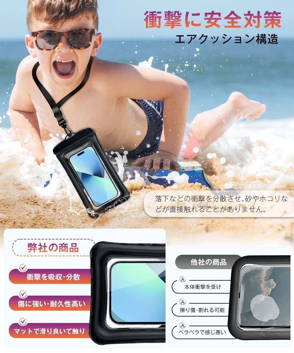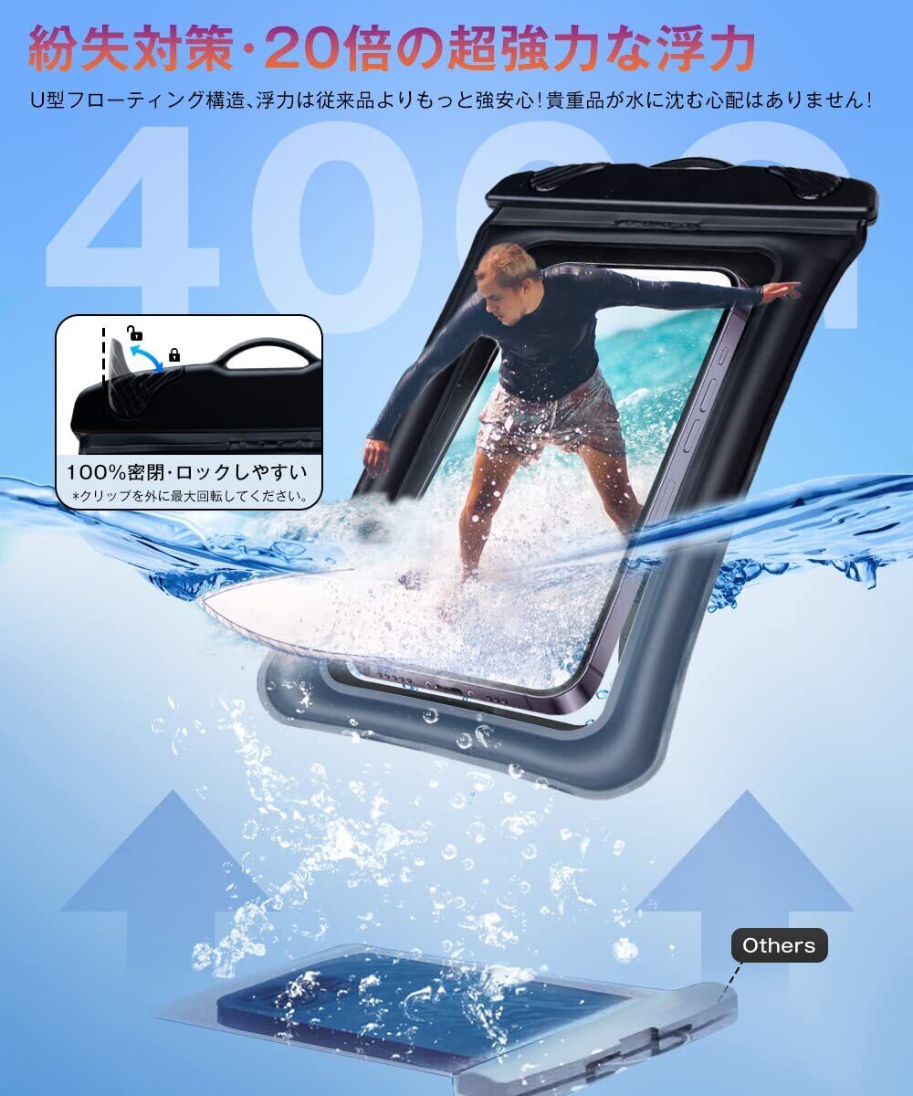 【紛失・衝撃に安全対策!20倍の超強力な浮力】スマホ防水ケースは、背面に水に浮くふわふわの「エアクッション構造」を搭載して、または柔軟で高密度のスポンジを内蔵して20倍の超強力な浮力を提供し、400グラムの浮力に耐えられます!万が一海などで落としてしまっても、スマホの重みで沈む心配がありません。さらに、通常の防水カバーよりも耐衝撃性に優れています。フローティング構造が落下などの衝撃を分散・吸収して本体に伝えなくなり、砂やホコリなどが直接触れることがありません。高い耐衝撃性を誇り、スマホを全方位からしっかりと守ります。PS:浮力受容範囲400以下グラムくらい、受容範囲を超えて浮かべない場合がございます。