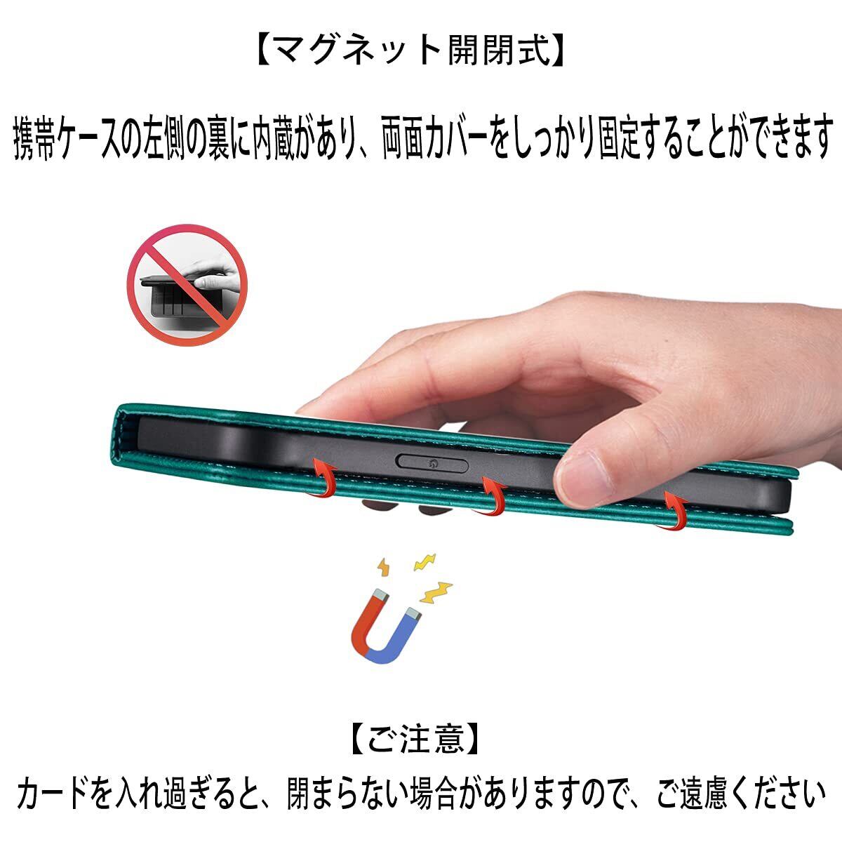 【カードポケット付き】:財布型ケースとして、名刺やお札などを入れるカードポケットがつき、ちょっとしたお出かけにもスマホケース一つでOK!日常生活に便利です。ただし、カードを入れ過ぎると、閉まらない場合がありますので、ご遠慮ください。