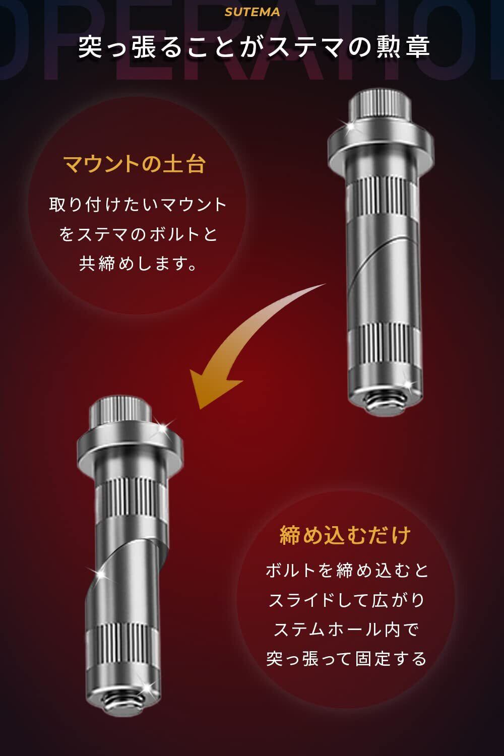 【使用方法】 8mmの六角ロングボルトを締め込む事で、マウントが広がります。取り付けたいマウントをステマのボルトに共締めし、締め込む事でステマがステムホールに固定され、マウントもステマのボルトに固定されます。クランプバーや1インチボールなどを固定し、その上にマウントパーツを乗せていくことができます。