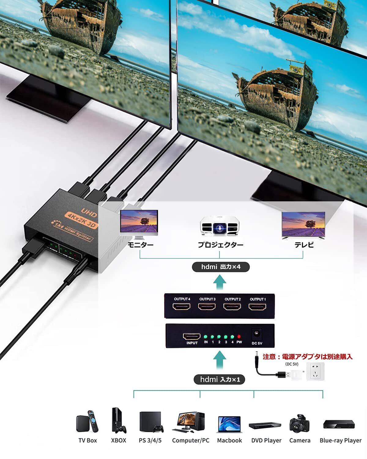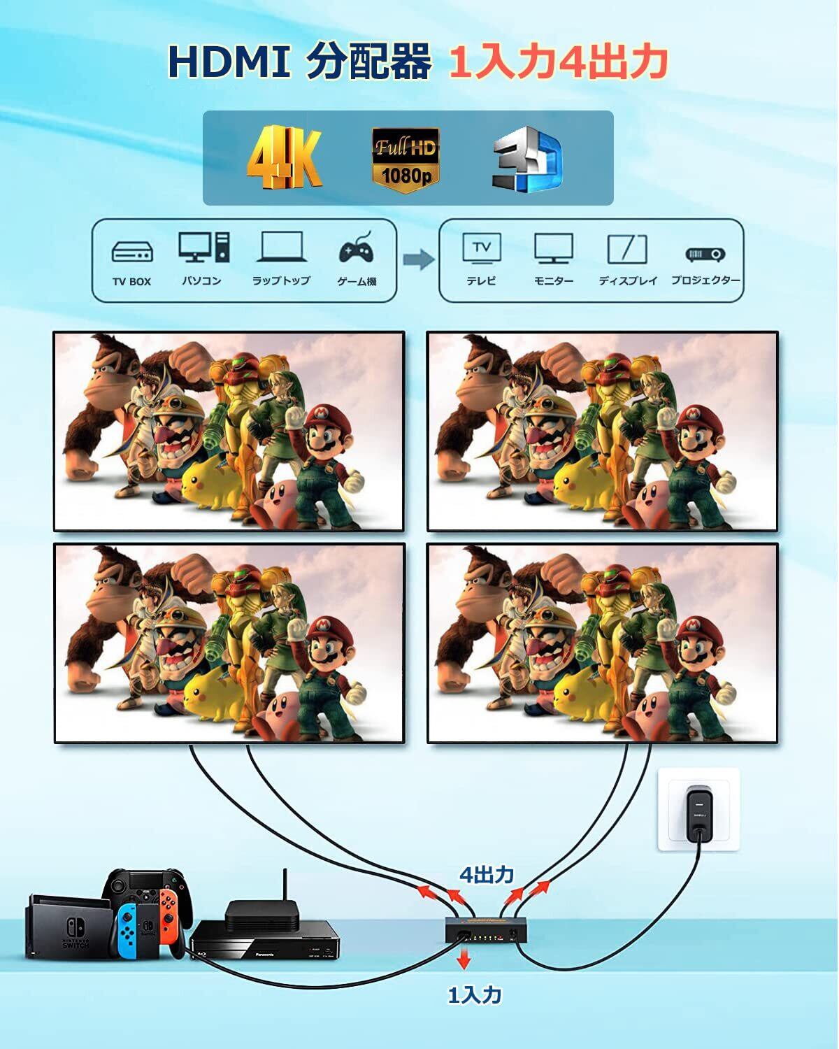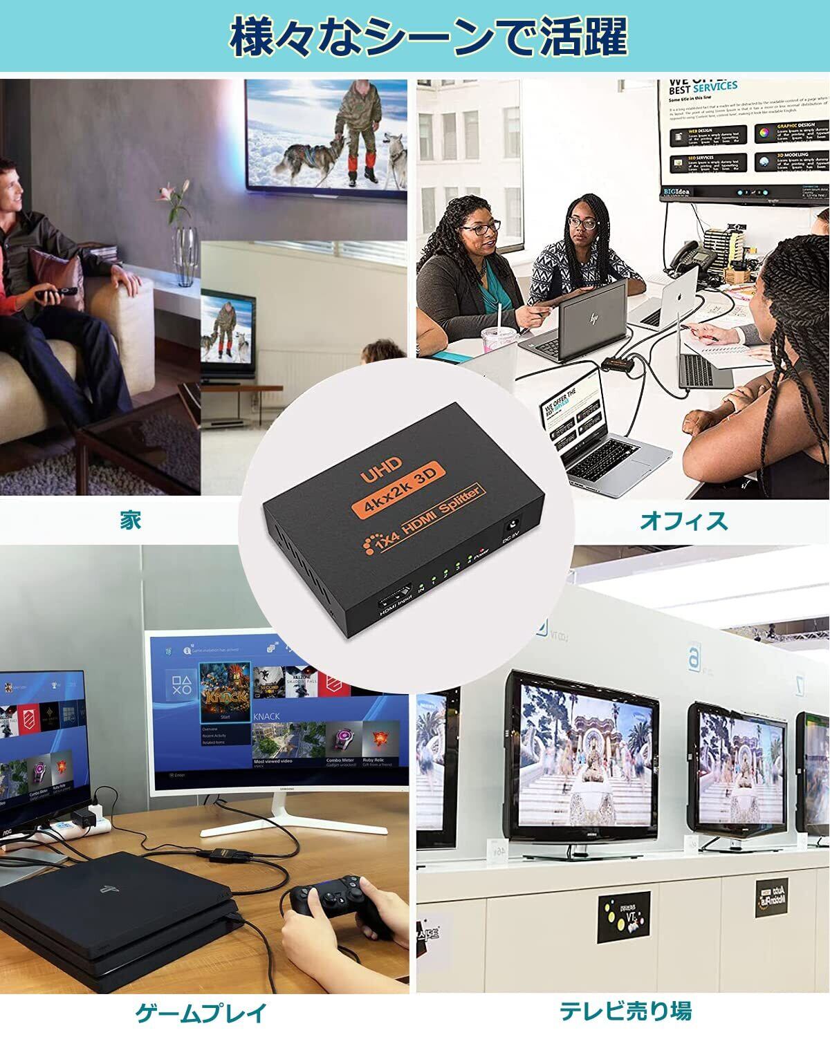 HDMI スプリッター 1入力4出力 4K 60Hz 1x2 HDMI 分配器 4画面同時出力 hdmi 増設 オーディオ同期 3D 1080p 4つのポートを同時に使用して複数画面出力可能 接続簡単 PS5|Xbox|HDTV|DVD|PCなど幅広く対応 (日本語取説書付き)
