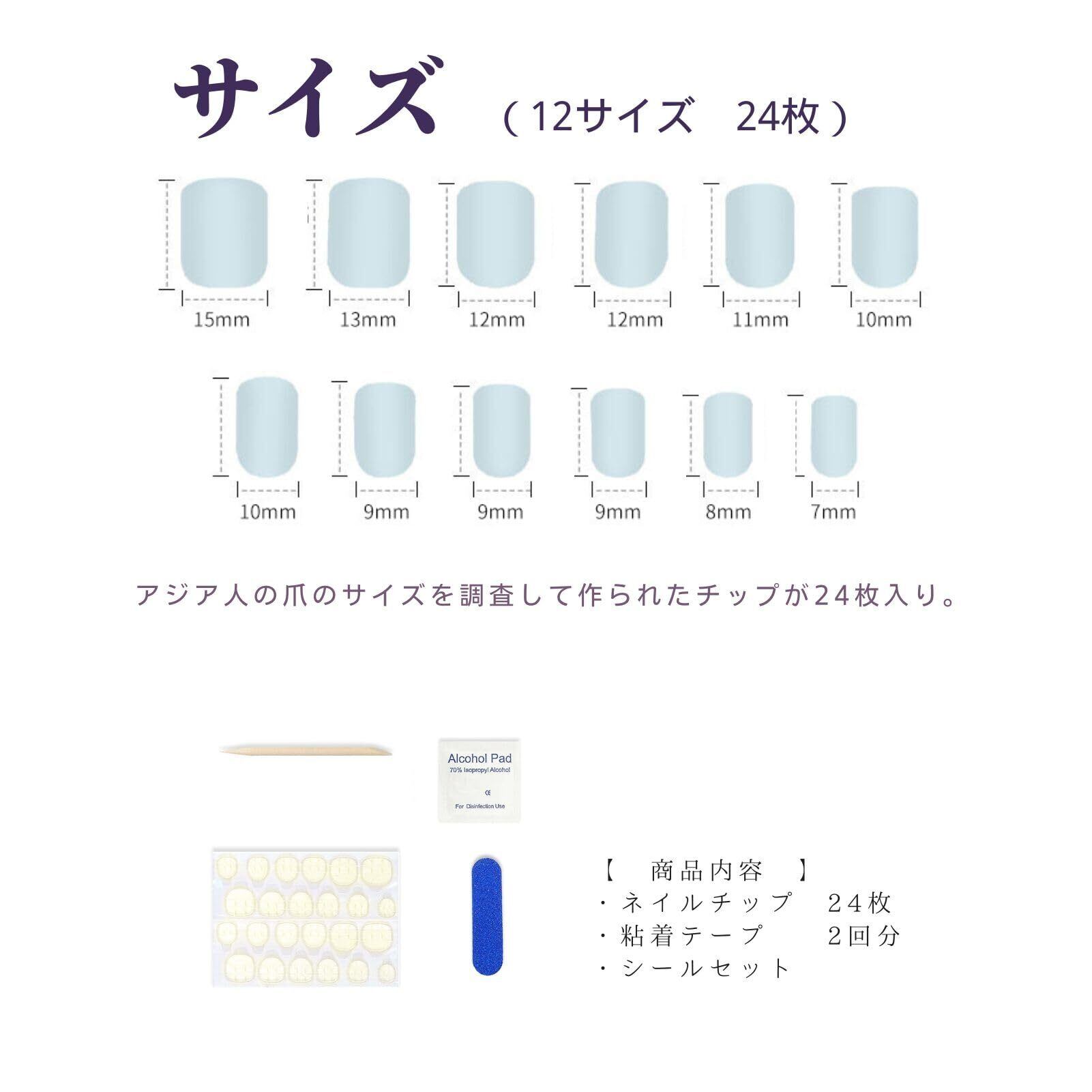【サイズ】アジア人の爪のサイズを調査して作られたチップが24枚&12種類入ります。