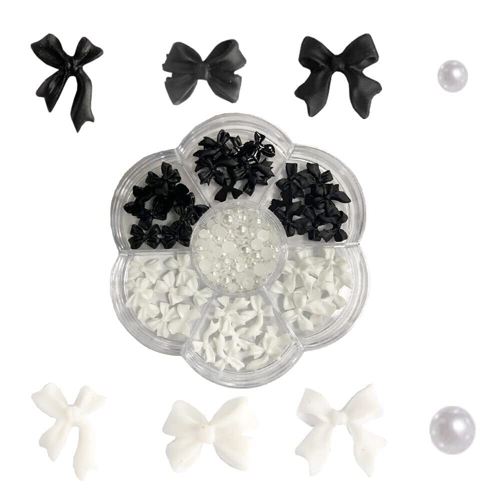 可愛いお洒落なリボン、半円パールが入っていたネイルパーツセットです、可愛いお洒落なリボンパーツ。定番の黒と白が3種類ずつ入っています。