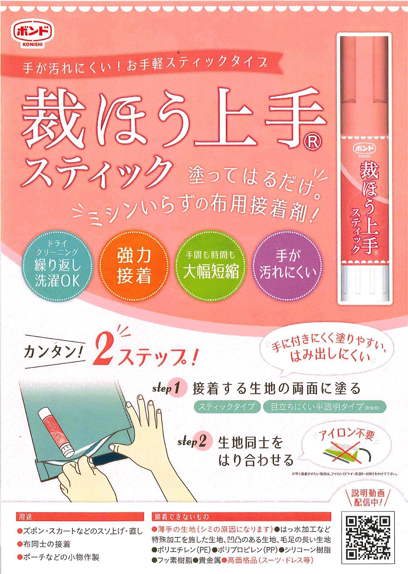 スティックタイプで手につきにくく、カンタン塗りやすい!ミシンいらずの布用接着剤 「裁ほう上手」のスティックタイプ。お得な2本セットです。