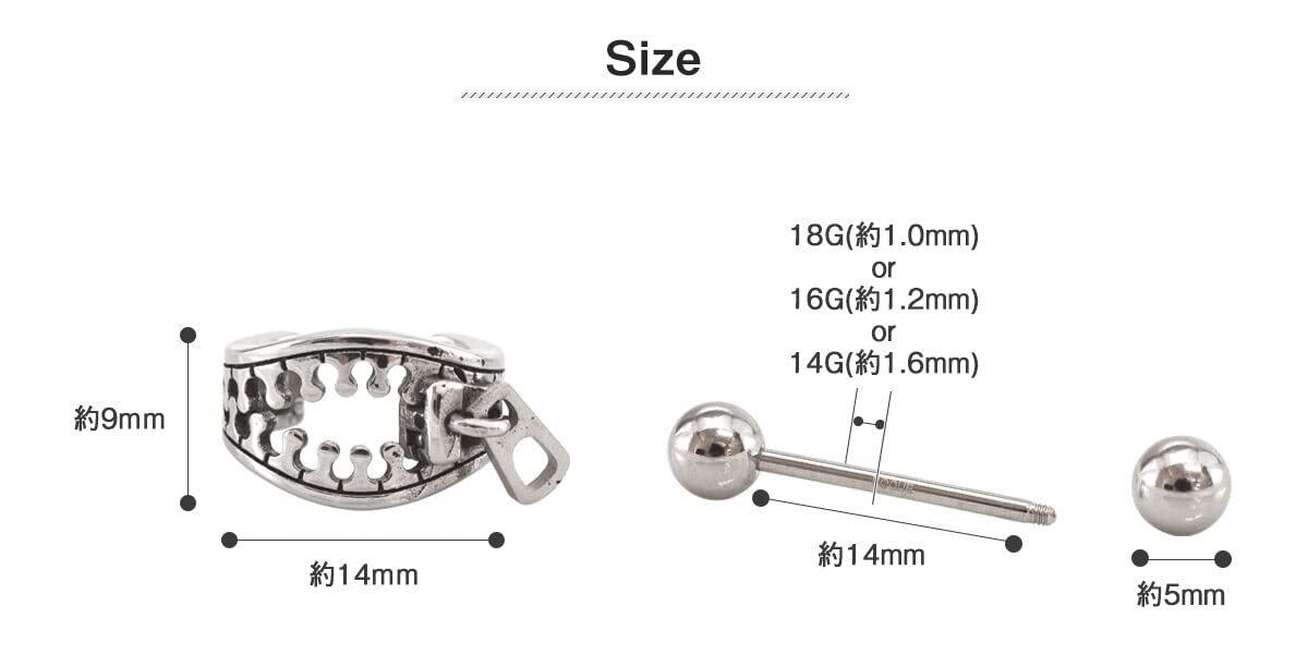 ゲージ(太さ):18G(軸の太さ約1.0mm)/16G(軸の太さ約1.2mm)/14G(軸の太さ約1.6mm) 軸の長さ(内径):約14mm モチーフサイズ(縦×横):約9mm×約14mm キャッチサイズ:約5mm
