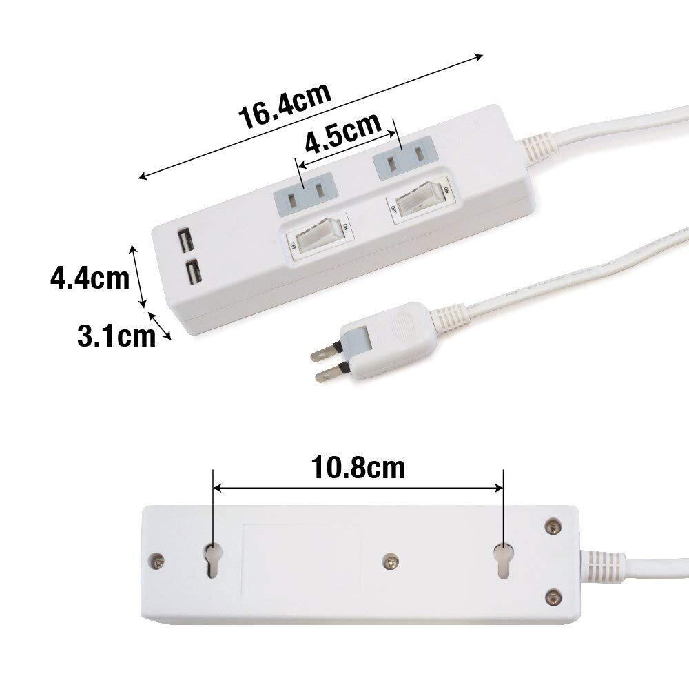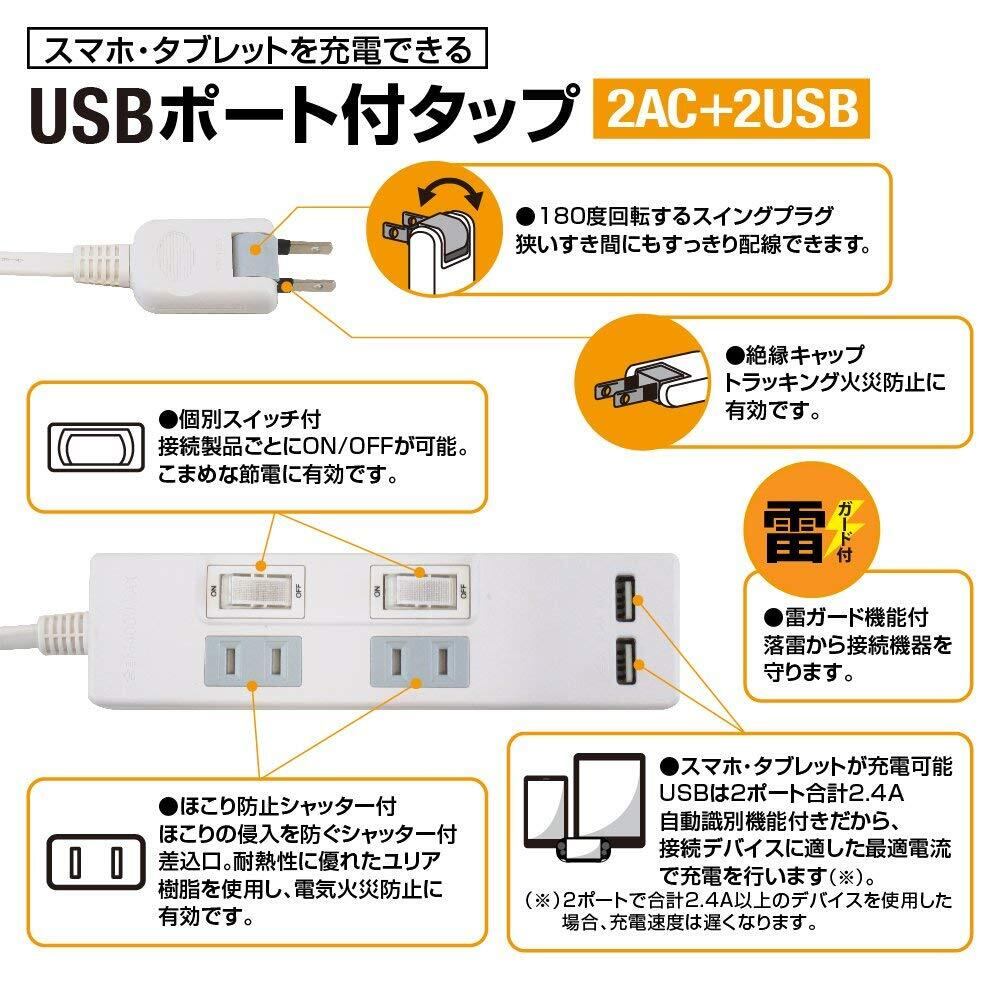 【18ヵ月保証・1台で4製品を同時接続】コンセント2個+スマホなど充電可能なUSBが2ポート一体型になった便利な電源タップ。安心の18ヵ月保証付き。
