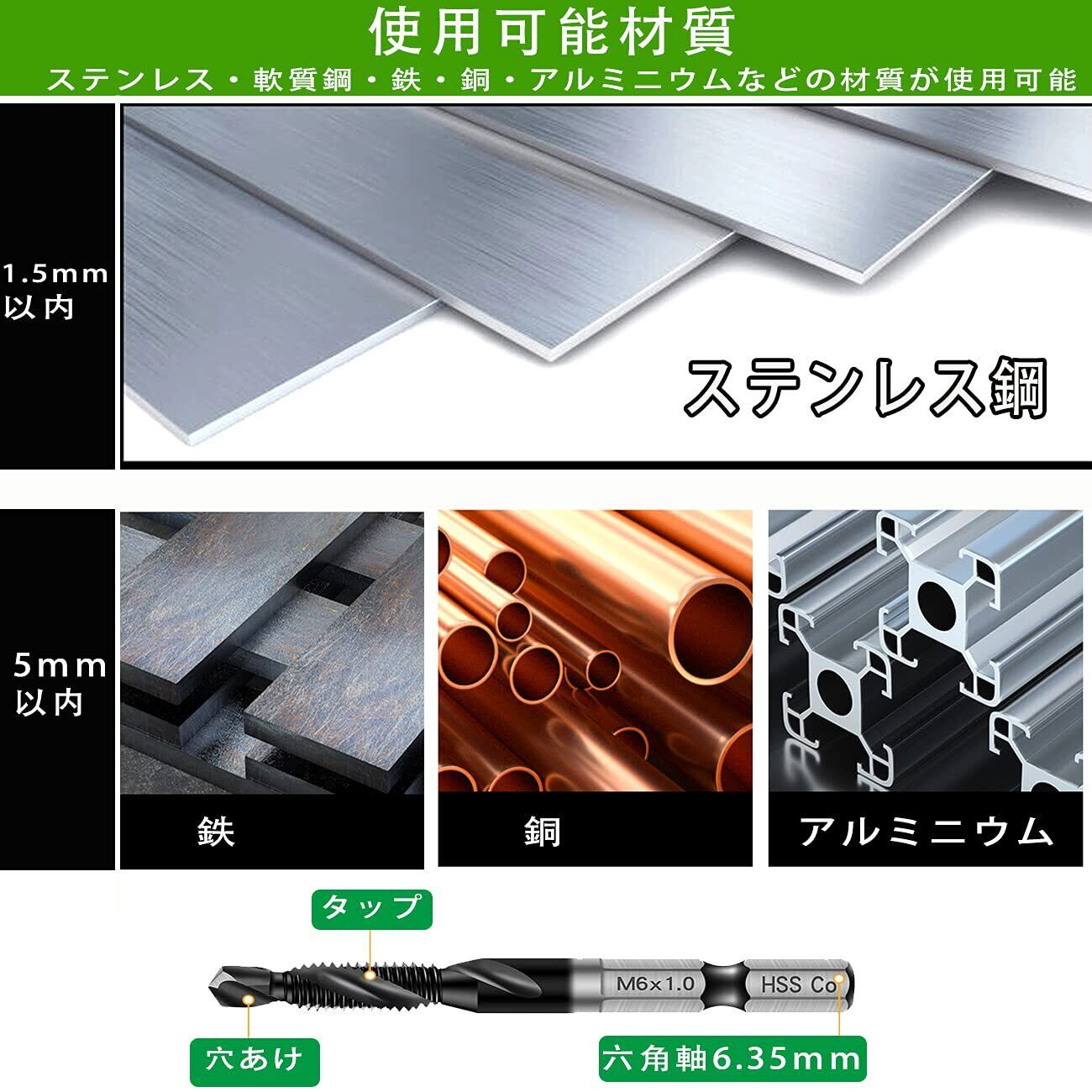 【適用範囲】:穴あけ、タッピングと面取りの機能を備えて、手間と時間を大幅に削減できて、気楽に作業できます。また軸の形状が六角軸なので、インパクトドライバー・電気ドリル・充電ドリルでも使用できます。